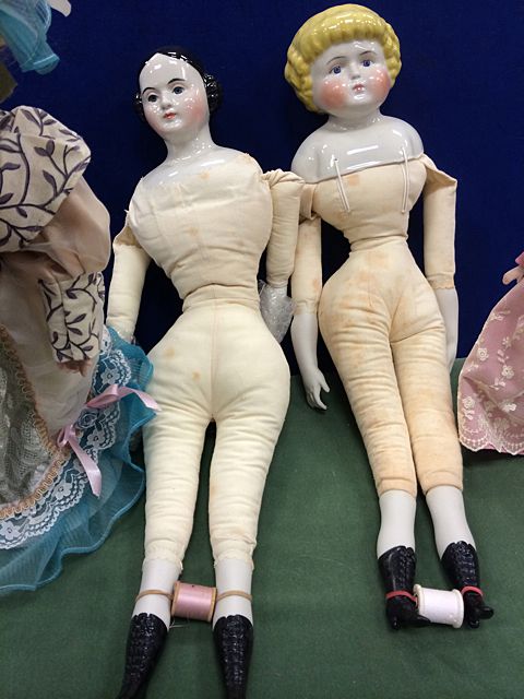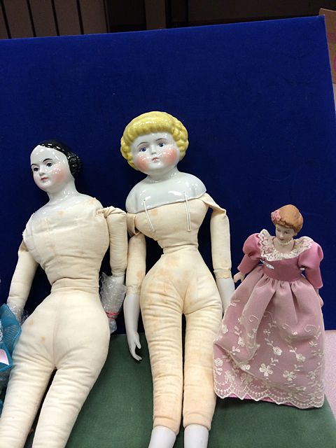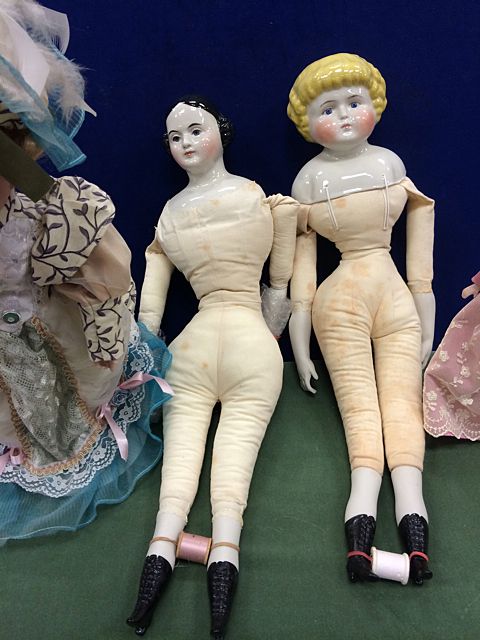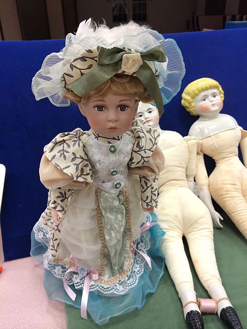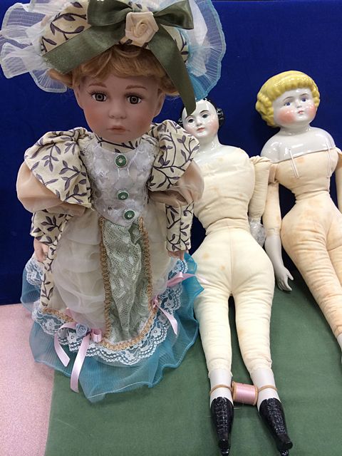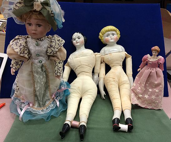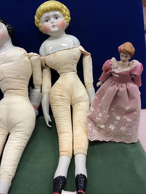 4 Porcelain Dolls, 1 from the Cathay Collection, 2 Jenny Lind Dolls, marked Cecile E. Johnson, and small porcelain doll. From the estate of Maria Cambra, member of the Jenny Lind Doll Club of Connecticut, lifetime collector and maker of dolls, who recently passed.