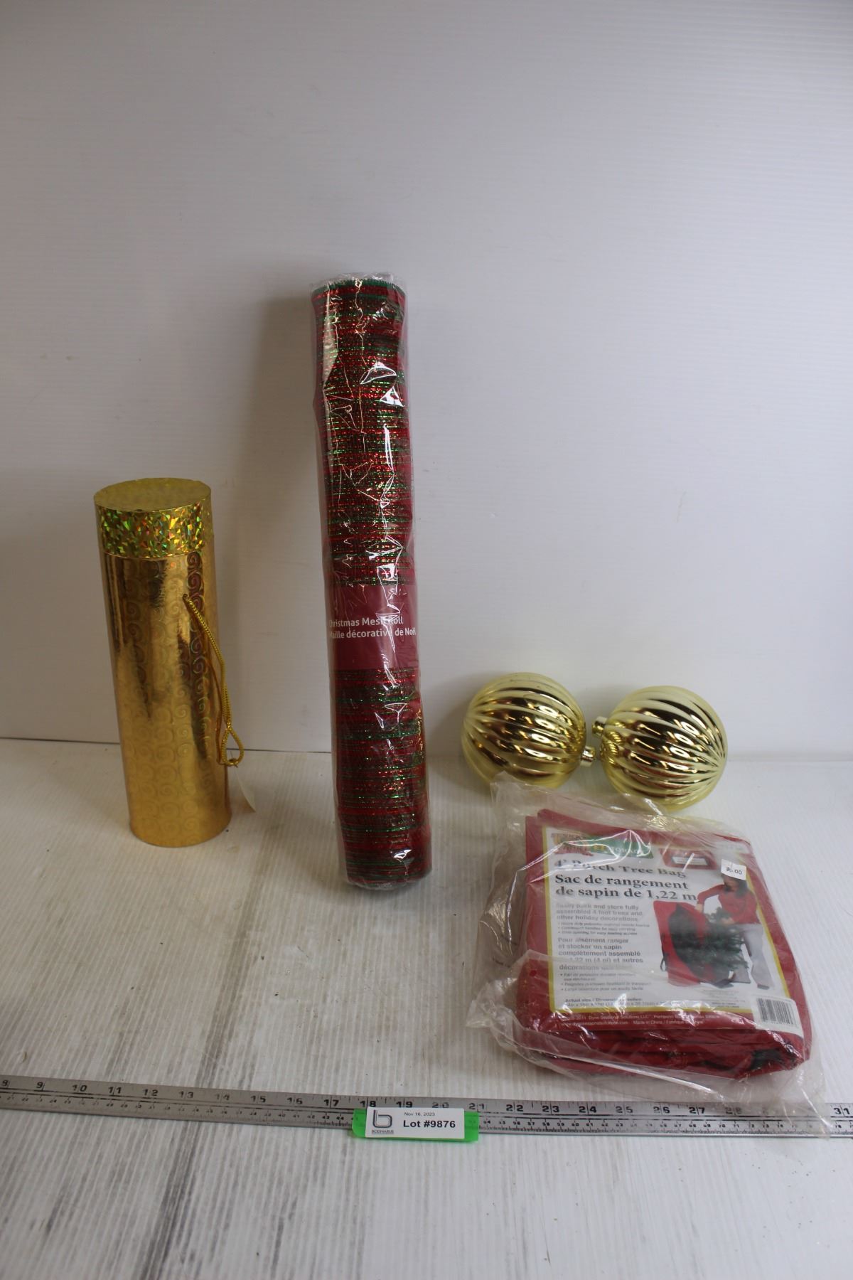 4' Porch Tree Bag, Christmas Mesh Roll, (2) Large Ornaments, Shimmery Cylindrical Box