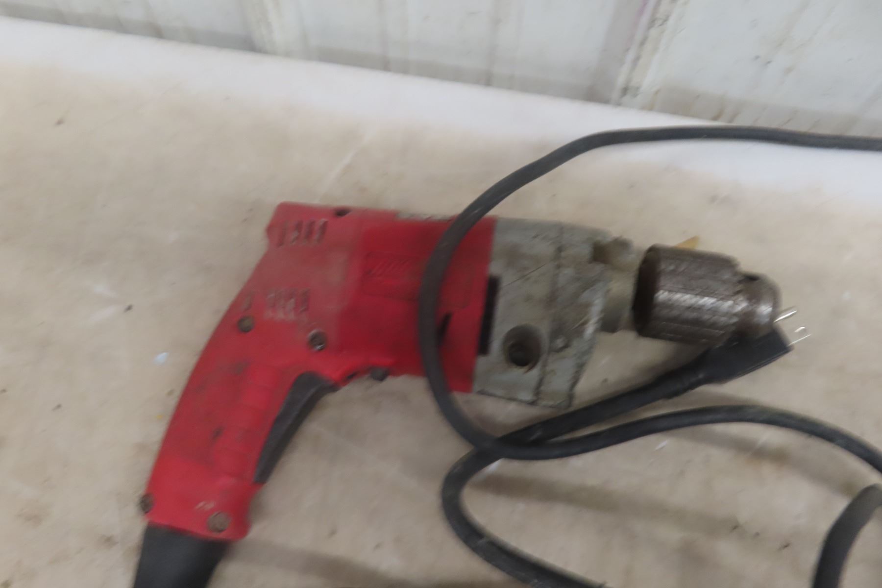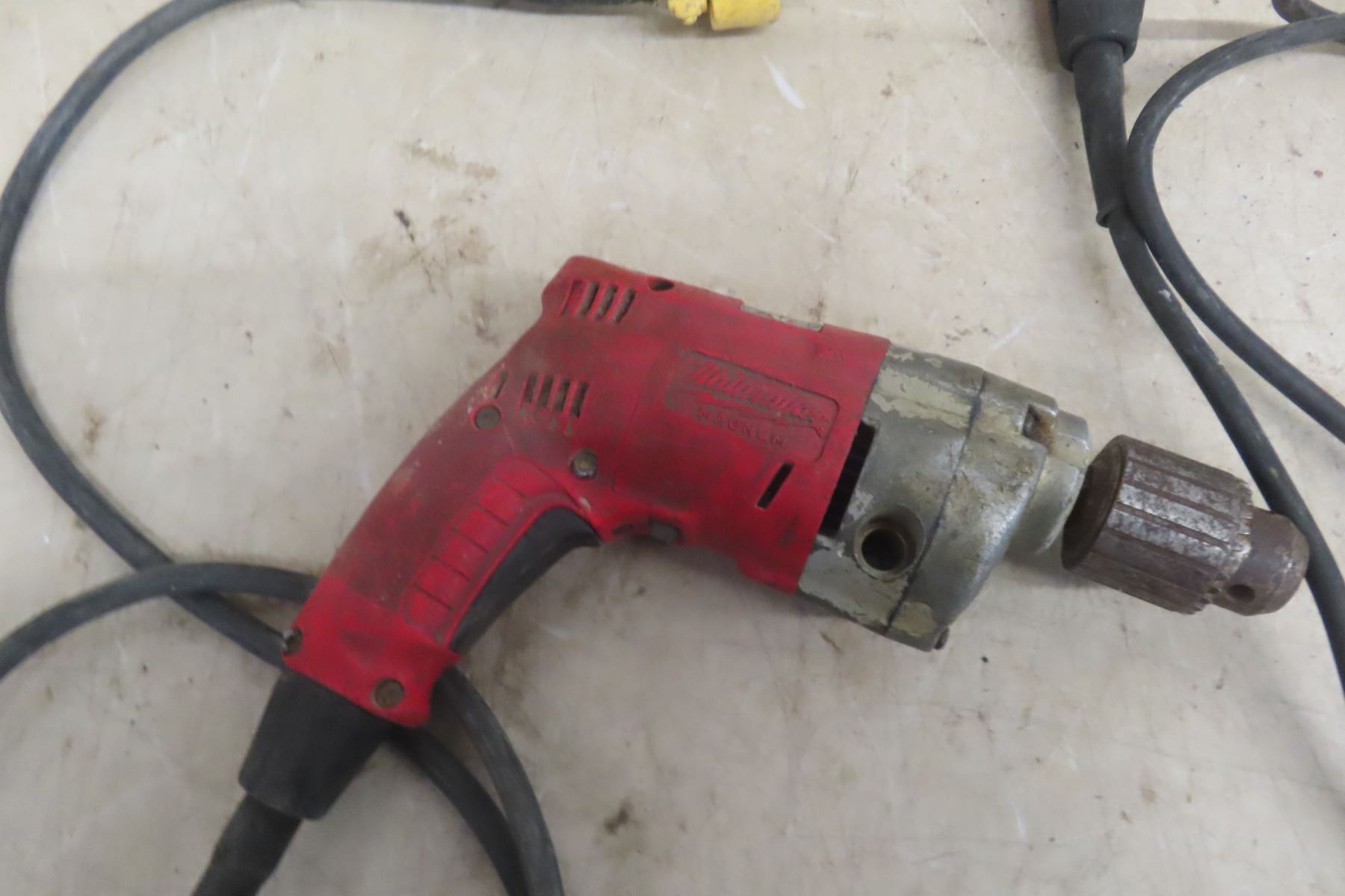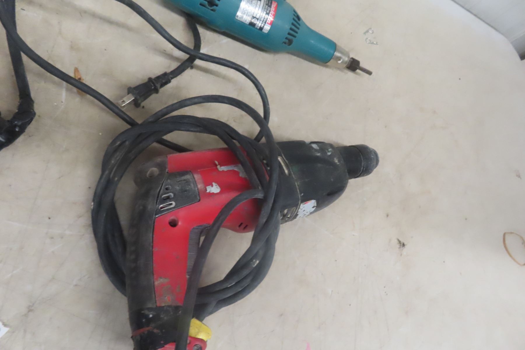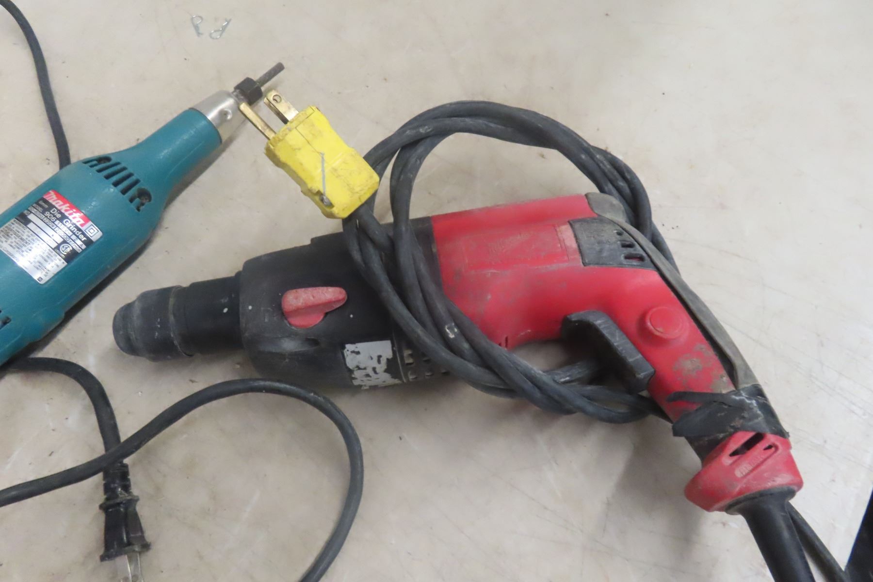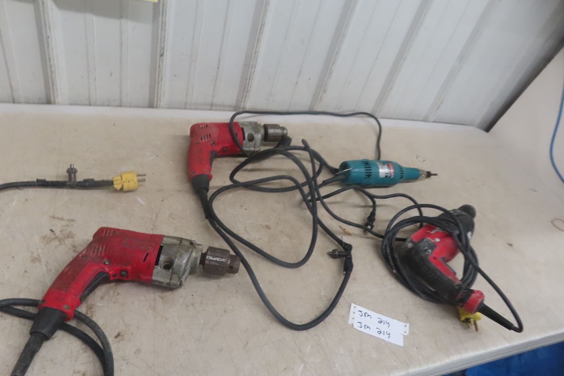 4 Power Tools: Milwaukee Hammer Drill and 1/2" Drills (x2); Makita Disc Grinder