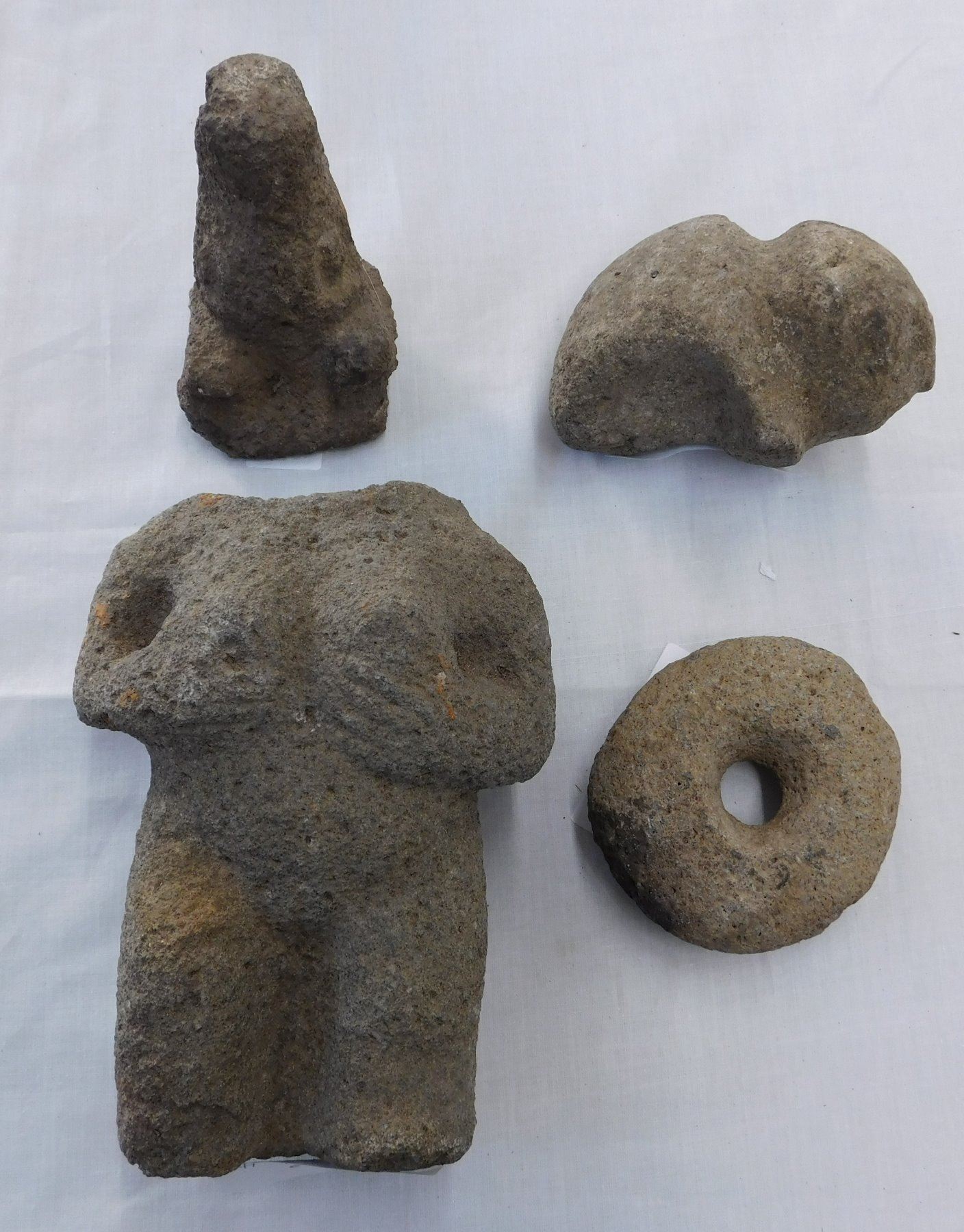 4 Pre-Columbian Artifacts, pre-Columbian items. Made of basalt, the items measure from 4" to 7". Costa Rica. Very cool zoomorphic mace head and donut stone. Condition: As found, see images. Shipping: $26.00 w/insurance and signature, due to size and weight.