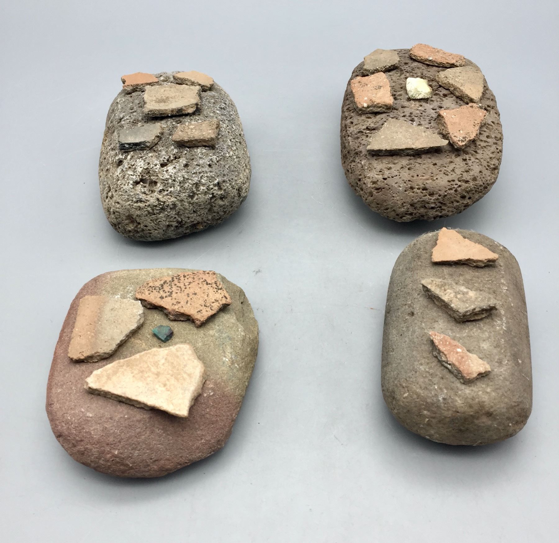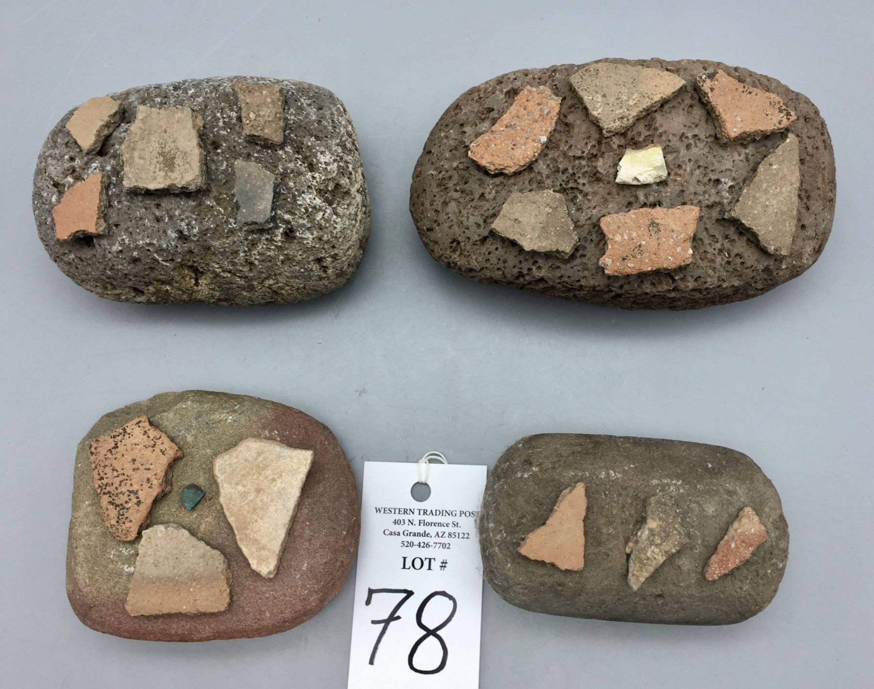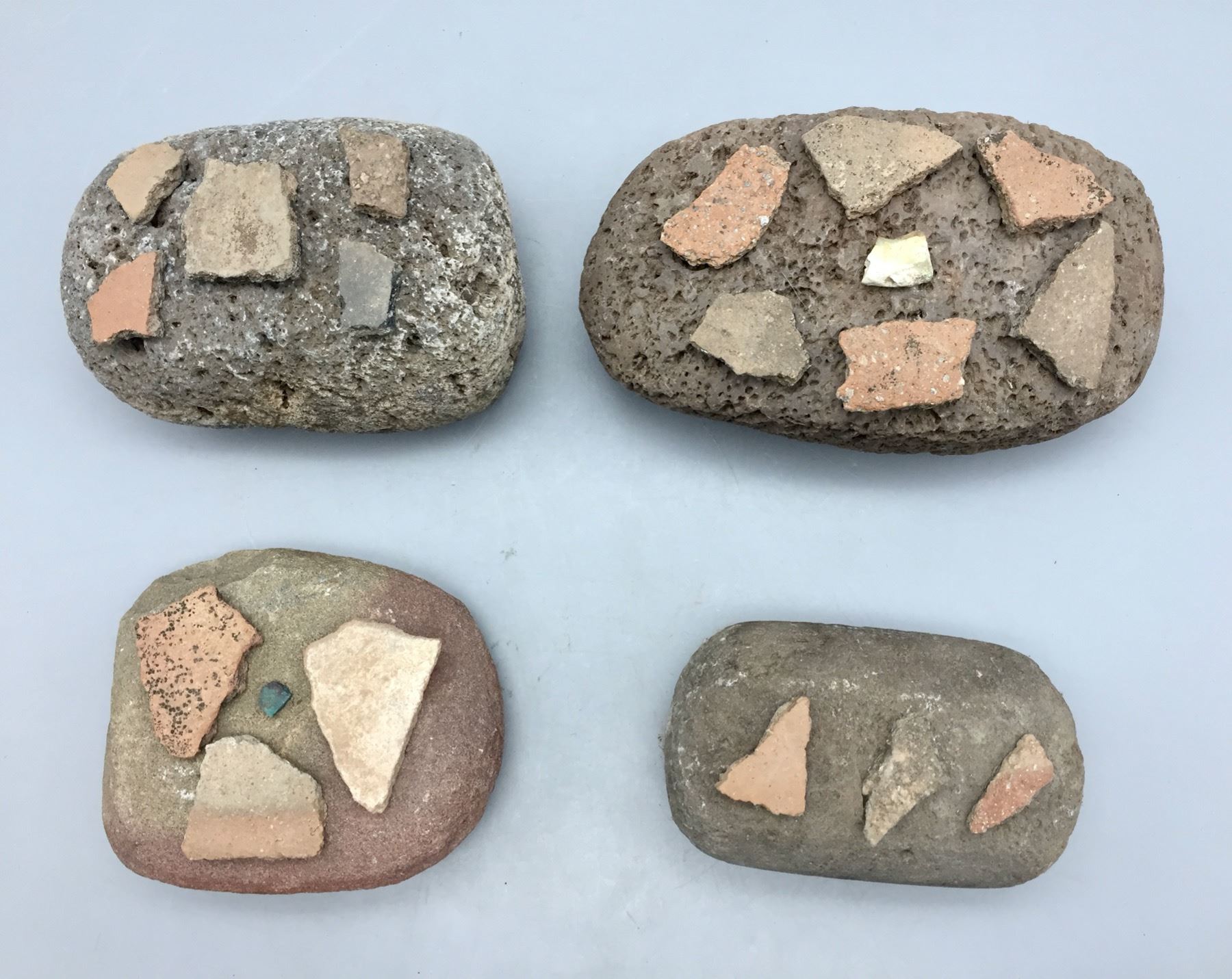 Description: Presented for sale in this lot is a group of four Prehistoric Manos that have been decorated with pottery sherds. Maker: Unknown. Approx. Age: Prehistoric. Size: From 4â€w x 6-1/2†long to 2-1/2â€w x 4†long. Condition: Good. Please look closely at the pictures - they are an important part of our description. Shipping: There will be a $8 handling / packaging fee for shipping this lot. The actual cost of postage will be added on top of that.