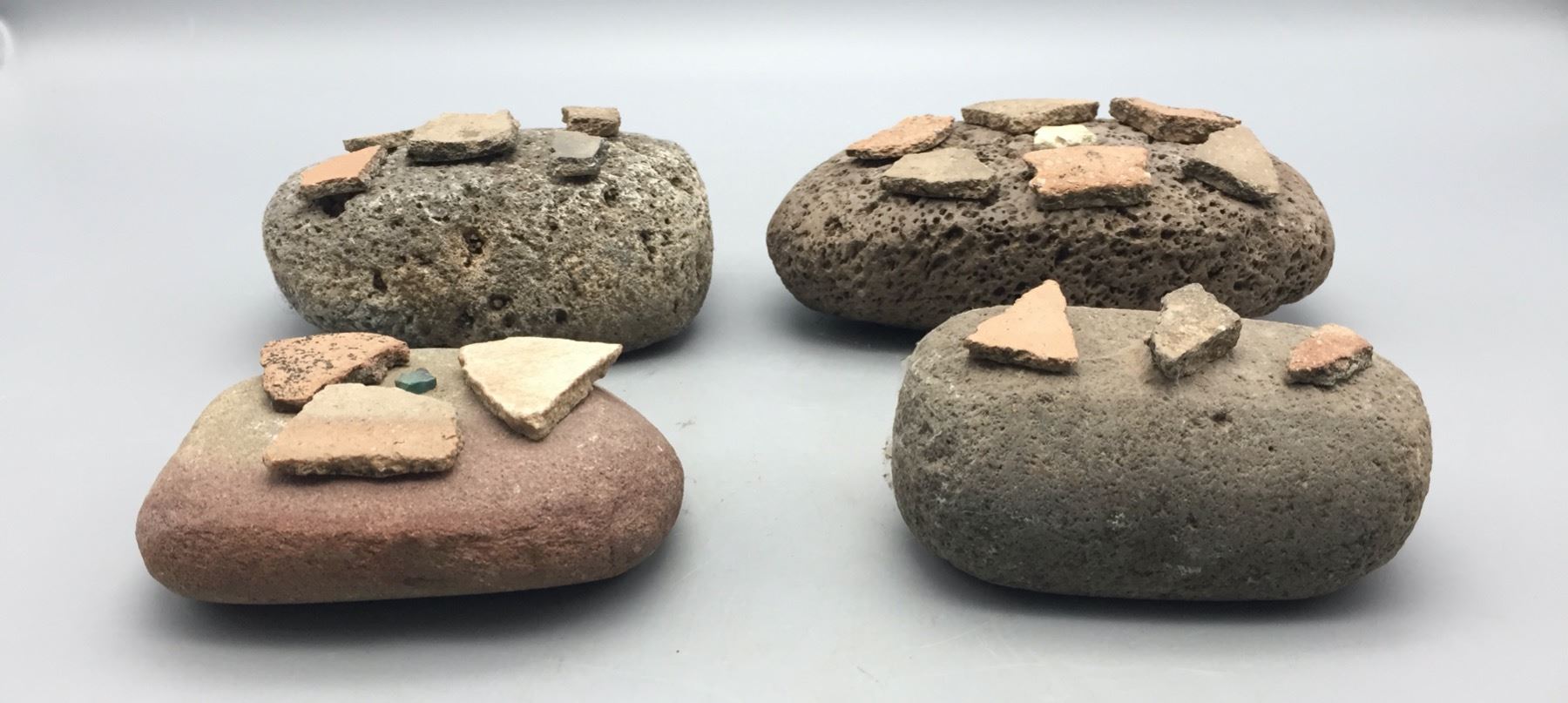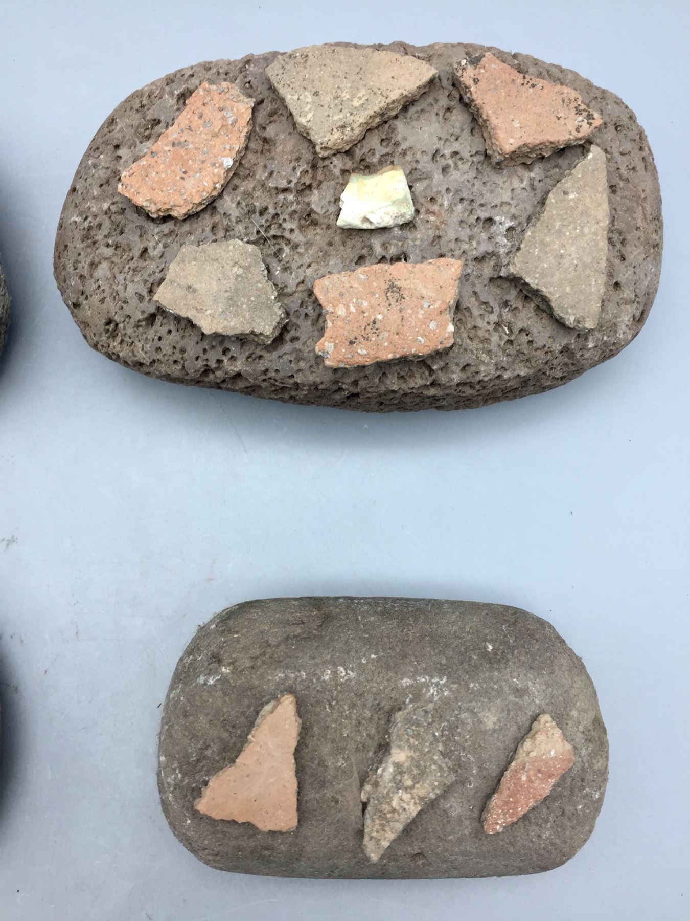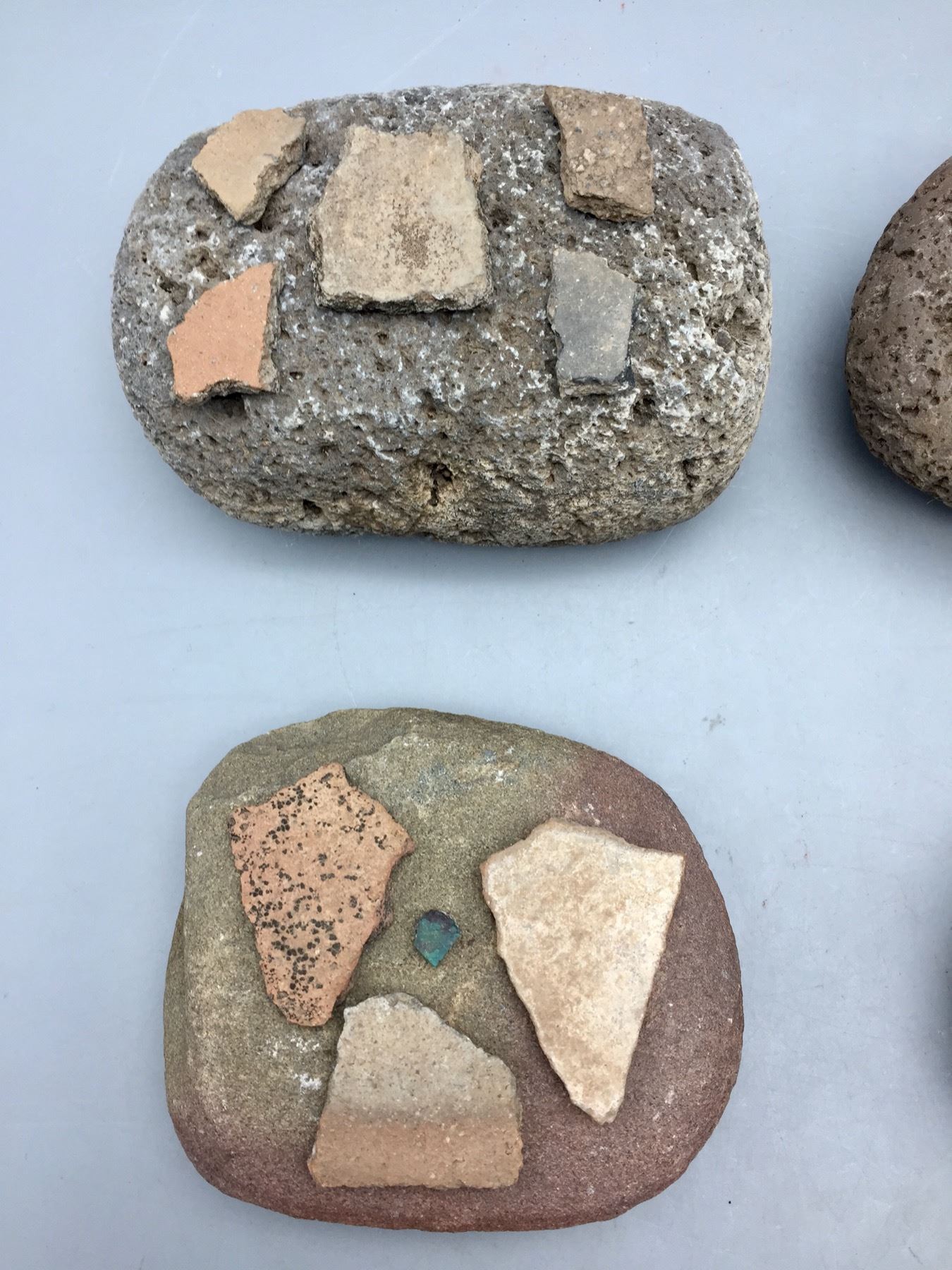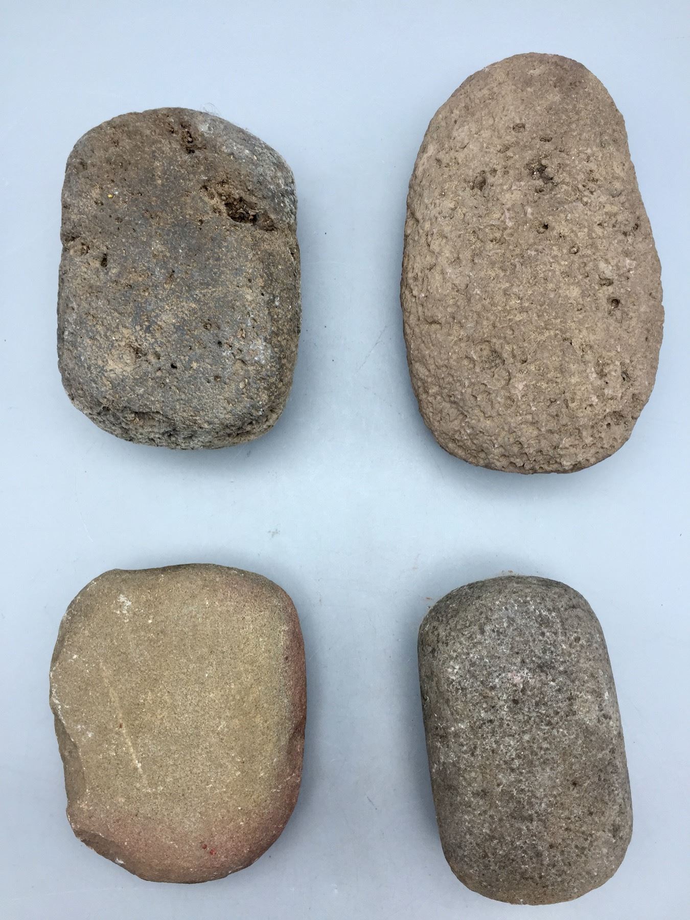 Description: Presented for sale in this lot is a group of four Prehistoric Manos that have been decorated with pottery sherds. Maker: Unknown. Approx. Age: Prehistoric. Size: From 4â€w x 6-1/2†long to 2-1/2â€w x 4†long. Condition: Good. Please look closely at the pictures - they are an important part of our description. Shipping: There will be a $8 handling / packaging fee for shipping this lot. The actual cost of postage will be added on top of that.
