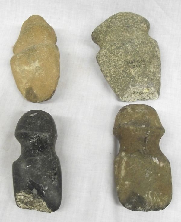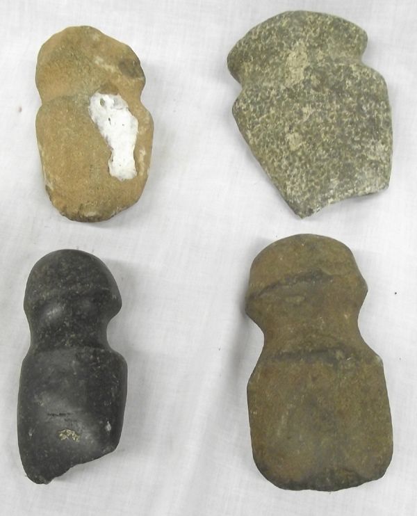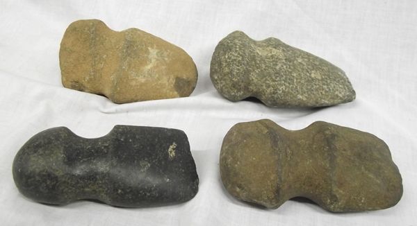 4 Prehistoric Stone Axehead Collection. Largest Fully Gooved is 4x5'' has damaged blade. Sandstone Fully Grooved Axe is 3x5'', slight chips. Green Stone Fully Grooved Axe is 3x5'', minor chips on blade. Small Greenstone Axe Fully Grooved, 2x4'', some damage to blade. All axe heads were glued on a display board and have some dried glue on back