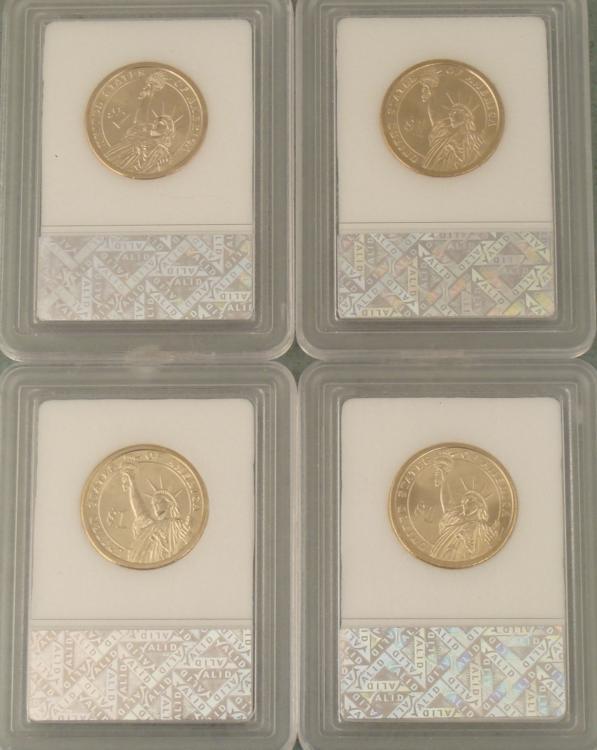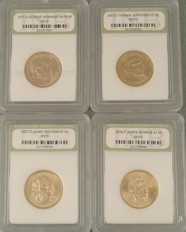 4 Presidential Gold Finished dollars Washington 2007-D Jefferson 2007-D Madison 2007-D Monroe 2008-P Grades: All are MS 70, and Sharp For International shipping please request a SHIPPING QUOTE Shipping and handling for this item is $6.95 plus additional insurance cost. The approximate shipping weight of this items is 1 oz. - 1 lb... For more information please see our shipping table by weight on our aboutme page . See over 2,000 art, antique & collectible items on our eBay Store, by clicking here! Like this item? See similar ebay items by clicking here! CLICK THE IMAGE TO ENLARGE Listed with Midwest Estate Buyer's Auction Management System ™ AMS™