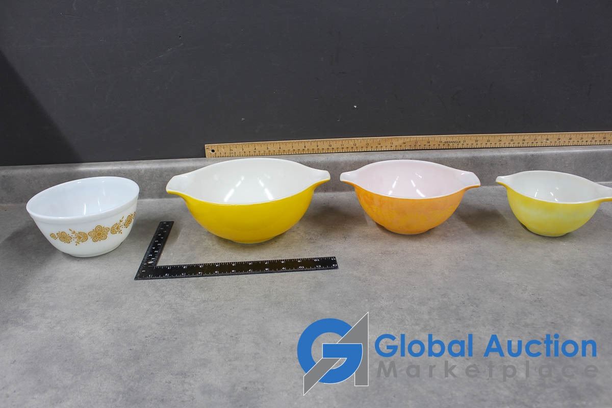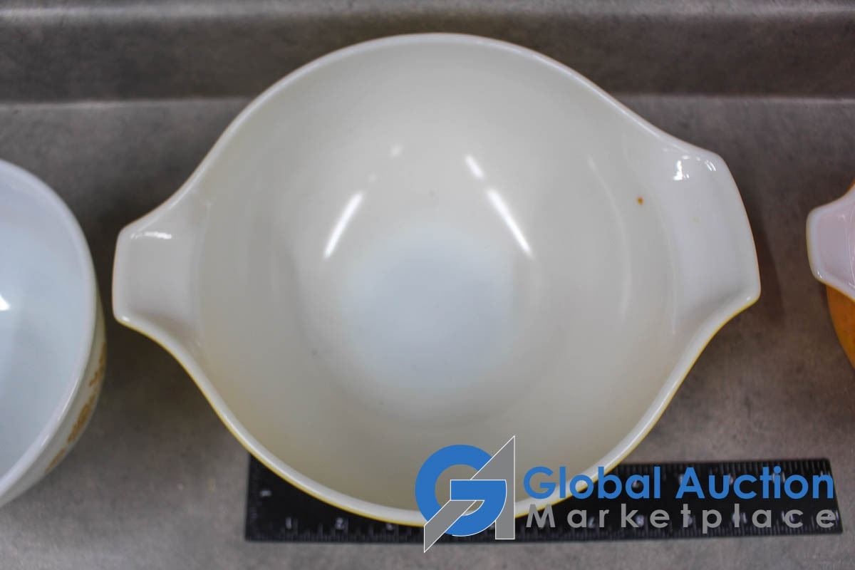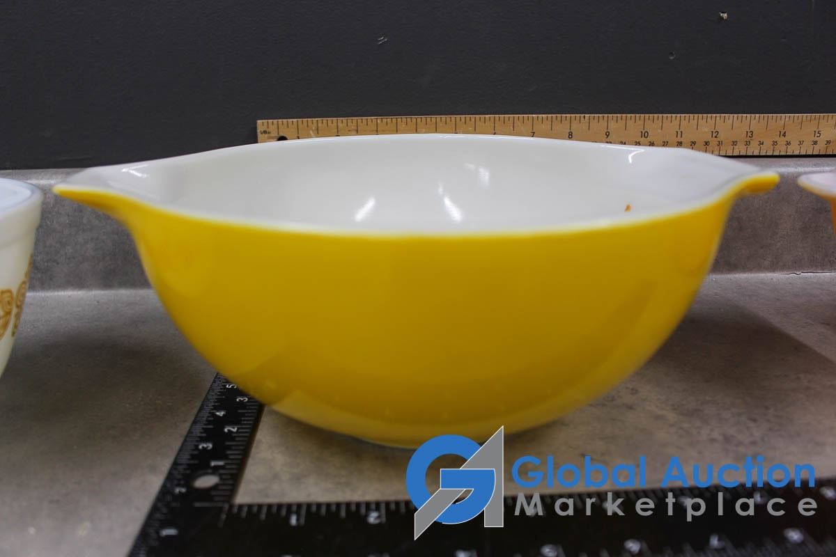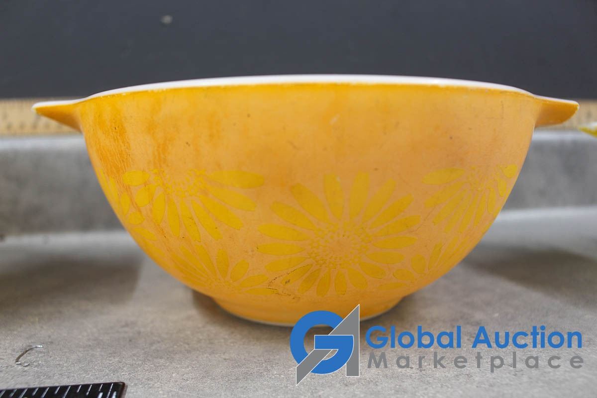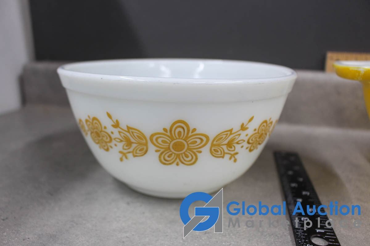 (3) Nesting Bowls - Yellow & Orange w/ Daisy's - 1.5 Pint; 1.5 Quart & 2.5 Quart Primary Yellow Bowl; (1) Butterfly Gold Pattern Bowl - 1.5 Quart