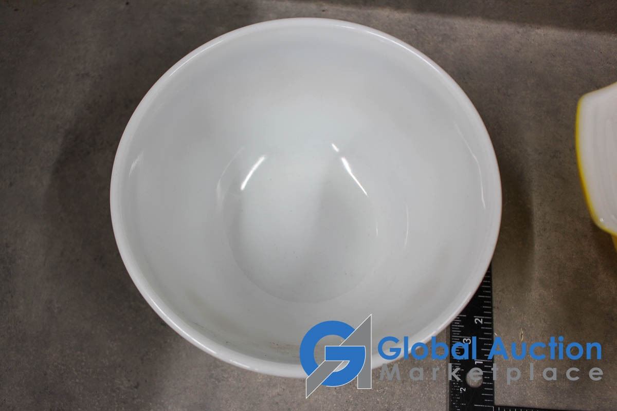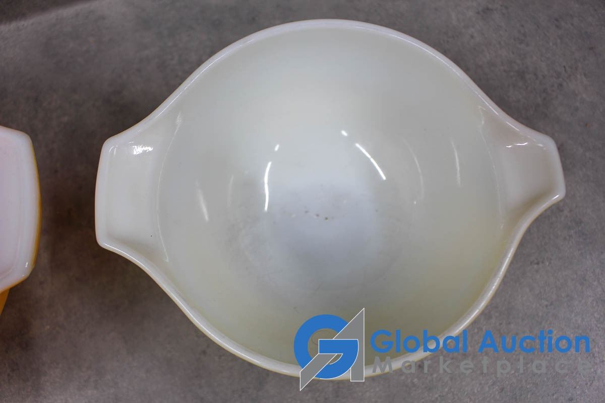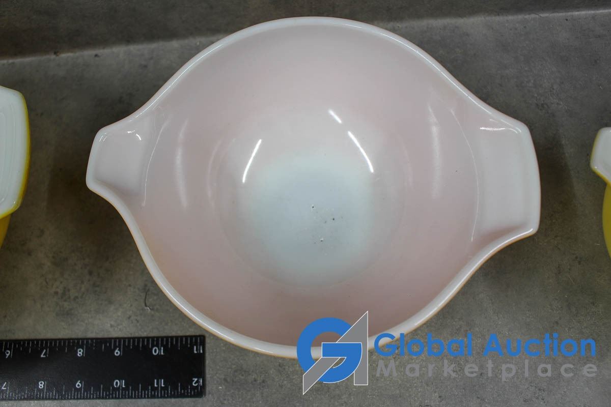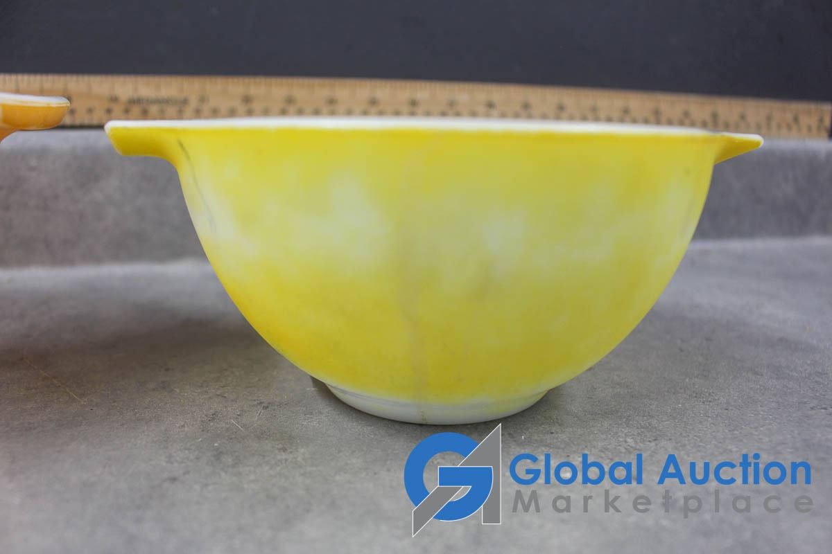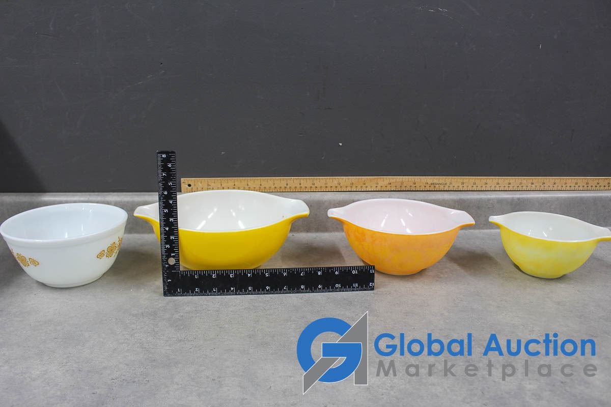 (3) Nesting Bowls - Yellow & Orange w/ Daisy's - 1.5 Pint; 1.5 Quart & 2.5 Quart Primary Yellow Bowl; (1) Butterfly Gold Pattern Bowl - 1.5 Quart