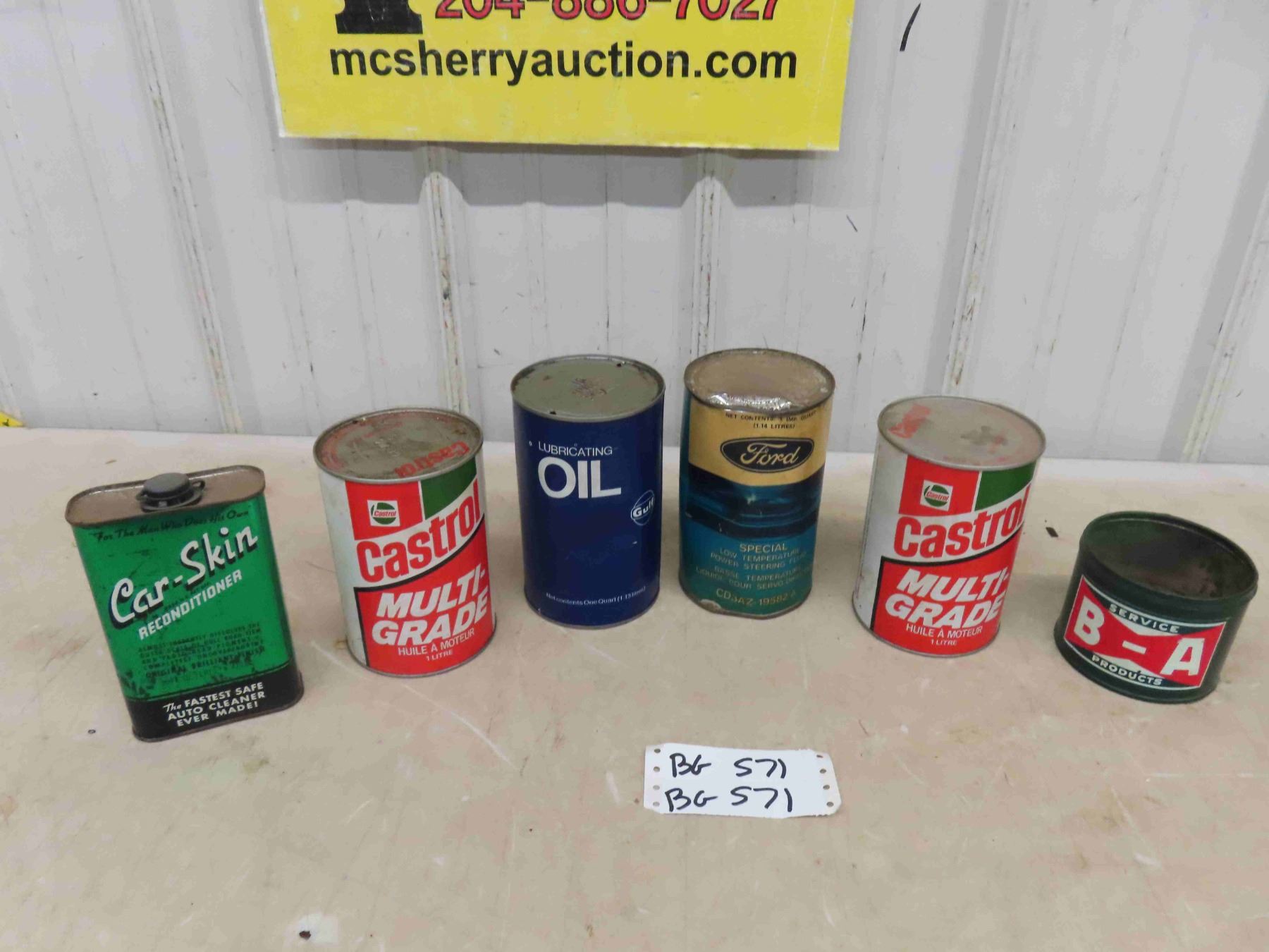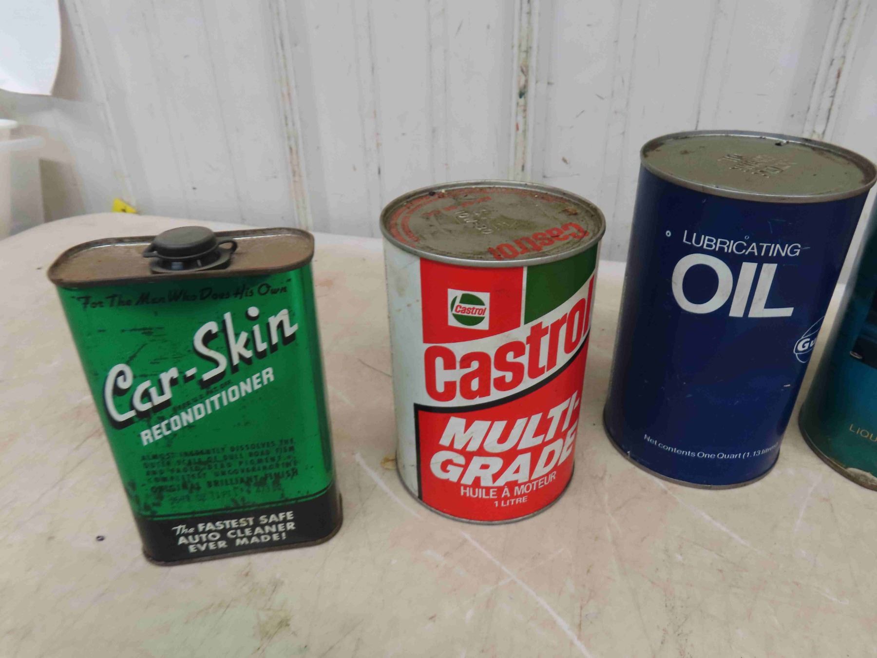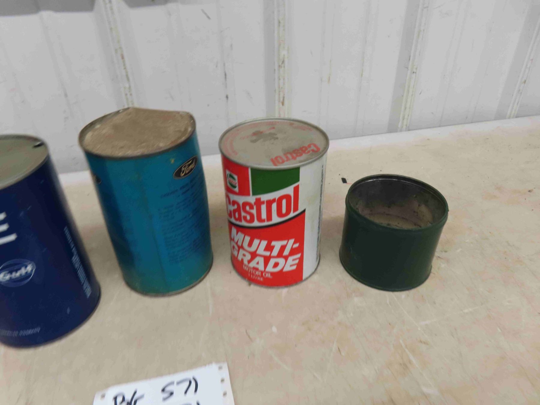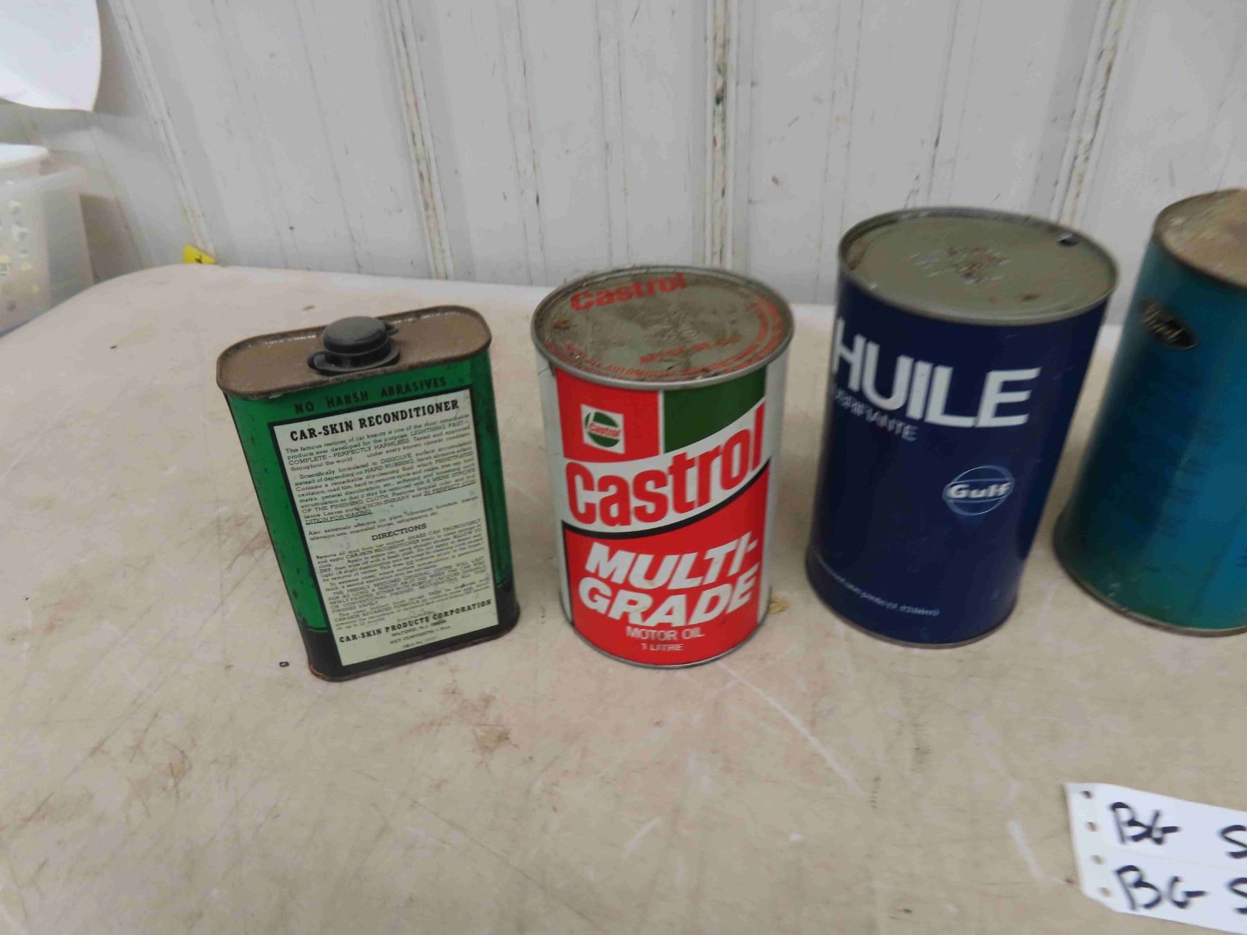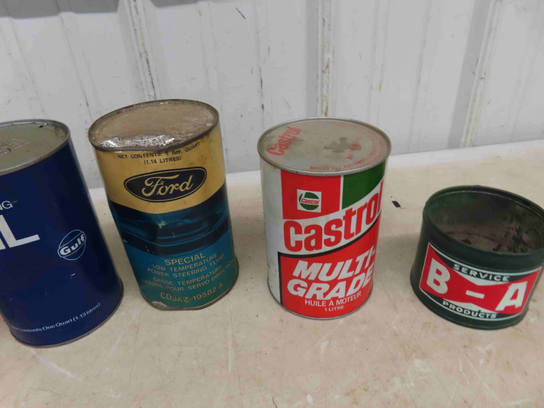 4 Quart Oil Cans ; Ford, Castrol Gulf, Car Skin Reconditioner, BA Tin Repainted