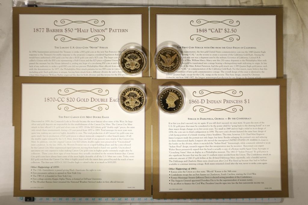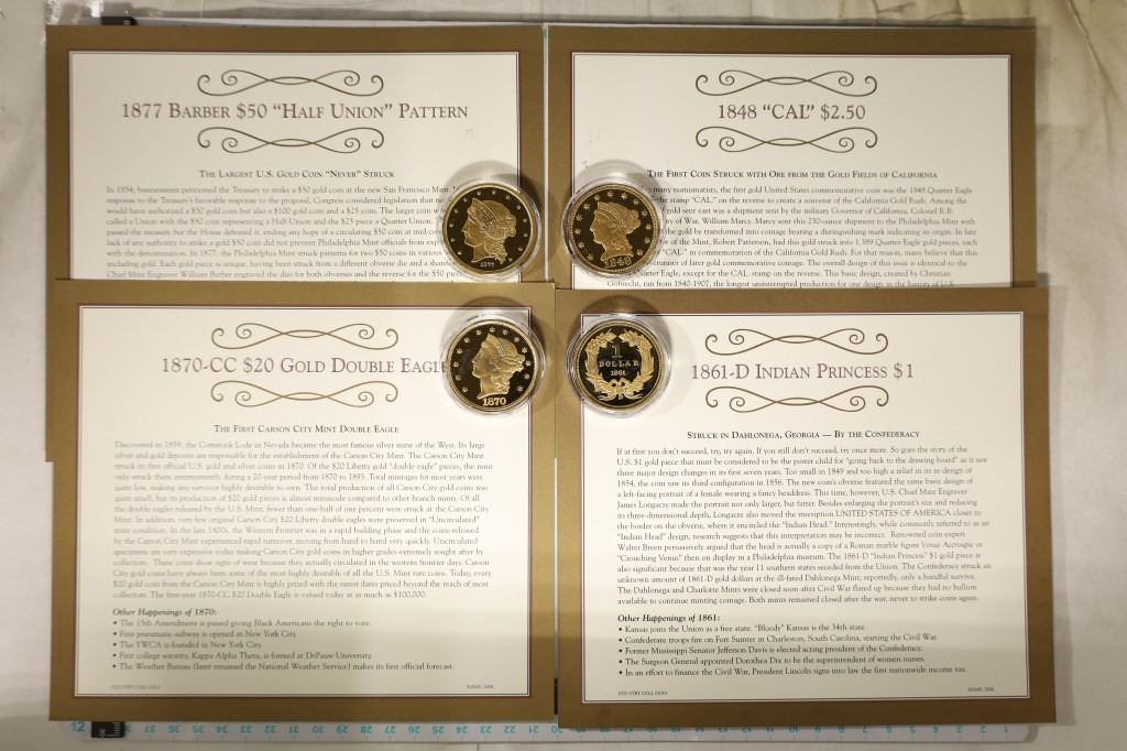 1848 "CAL" $2.50, 1861-D INDIAN PRINCESS $1, 1877 BARBER $50 "HALF UNION" PATTERN LARGEST US GOLD COIN NEVER STRUCK AND 1870-CC $20 GOLD DOUBLE EAGLE. ALL IN HARD PLASTIC CAPSULES WITH CERTIFICATES
