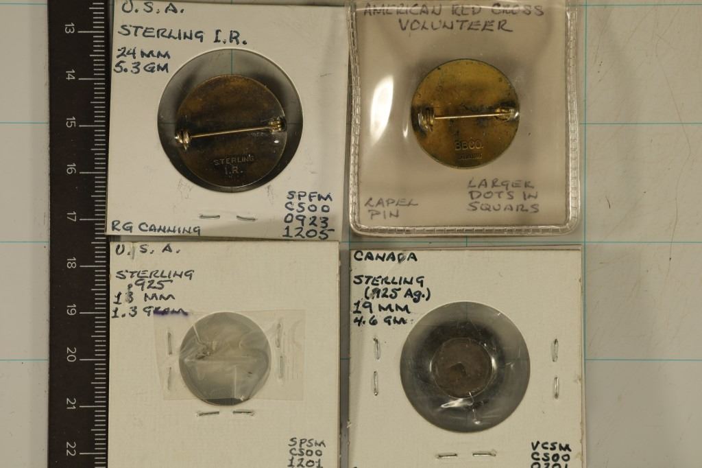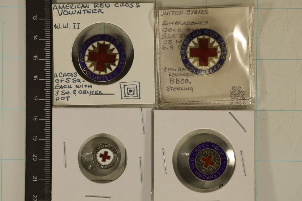 MARKED STERLING I.R. ON THE BACK, ANOTHER VOLUNTEER GOLD OVER STERLING MARKED BBCO ON THE REVERSE, 25 YEARS SMALL STERLING PIN AND CANADIAN RED CROSS SOCIETY BLOOD DONOR SERVICE. TOTAL 18.1 GRAMS OF STERLING