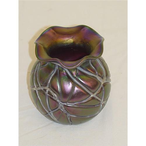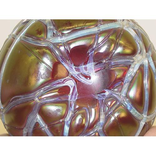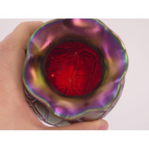 4" RED LOETZ TYPE ART GLASS VASE W/ APPLIED DECORATION-RICH BLOOD RED COLOR W/ RUFFLED TOP, UNSIGNED - MINOR WEAR