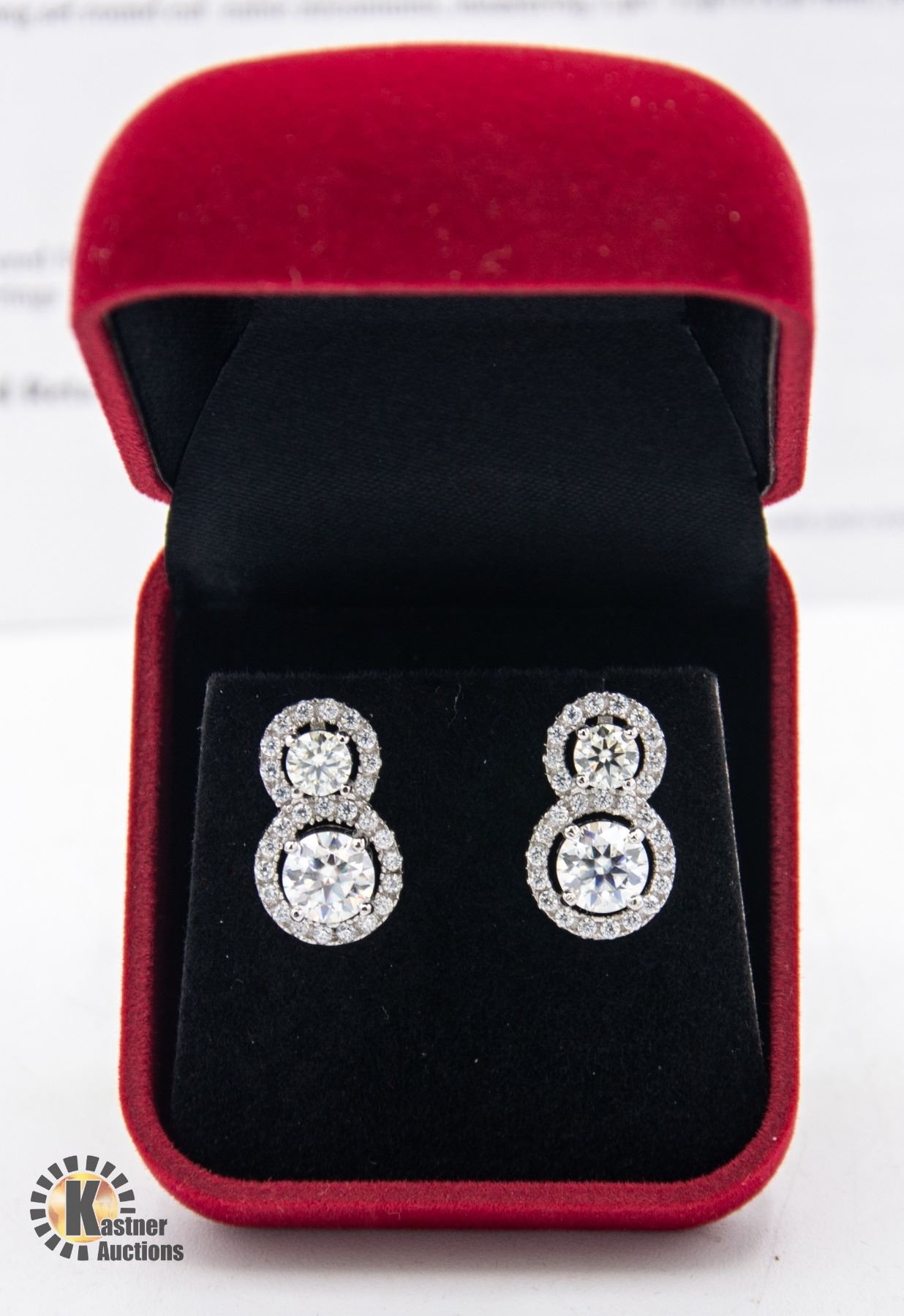 APPROXIMATE TOTAL OF 4.15 CARAT SET IN SILVER PLATED EARRINGS WITH 44 CUBIC ZIRCONIUM SET AROUND THE MOISSANITE STONES WEIGHING AN APPROXIMATE TOTAL OF 0.50 APPRAISED VALUE $2,465.00 **ALL ITEMS MUST BE REMOVED BY 5PM SATURDAY, DECEMBER 16TH 2023. ALL REMAINING ITEMS WILL BE SUBJECT TO A $6.00 PER DAY STORAGE CHARGE. ANY ITEMS REMAINING AFTER TUESDAY, JANUARY 2ND 2023 WILL BE CONSIDERED FORFEITED. NO REFUNDS WILL BE ISSUED FOR FORFEITED ITEMS. TO SCHEDULE A PICK UP APPOINTMENT CLICK HERE