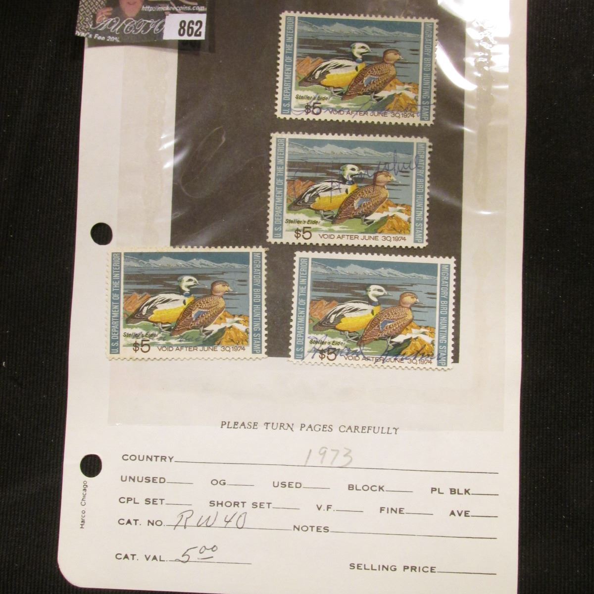 (4) RW40 1973 U.S. Department of Agriculture Migratory Bird Stamps, Fine, signed.