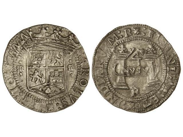 4 Reales. - MÉXICO. - R. - Anv.: Escudo entre M.-M góticas. Rev.: PLVS V en cartela, debajo R. 13,49 grs. Acuñación de Francisco del Rincón. MUY ESCASA. Cal-71. EBC-. - -