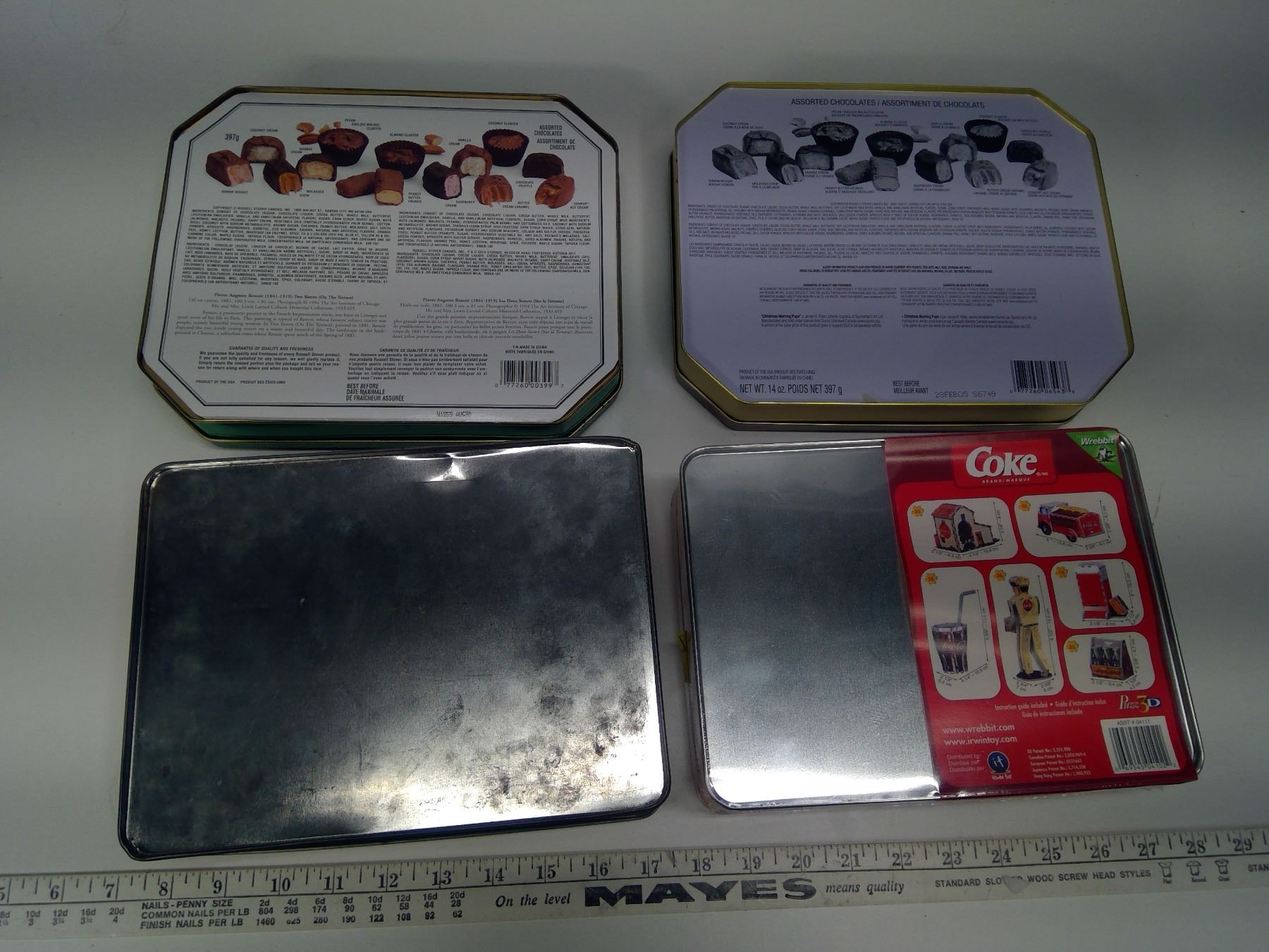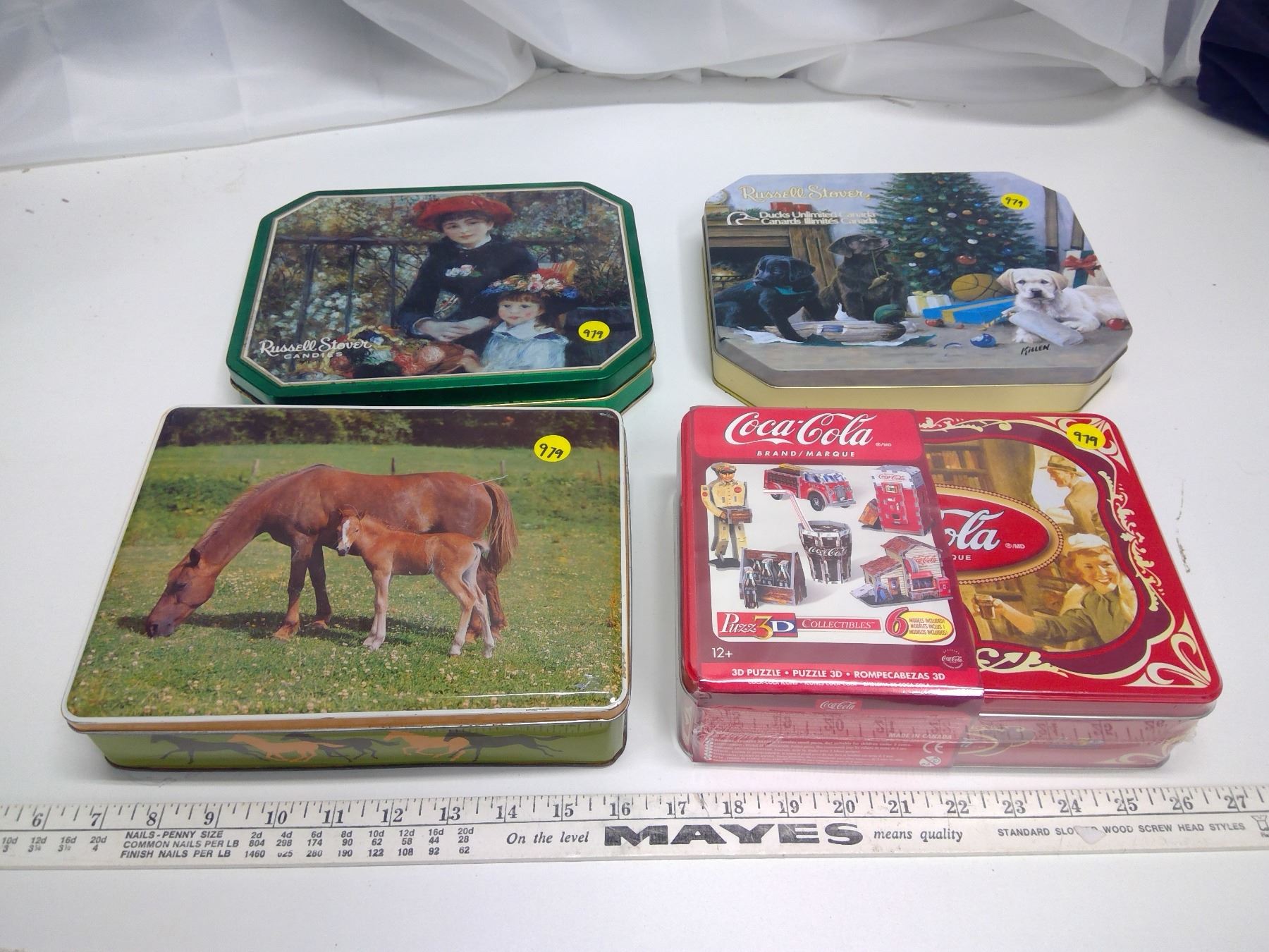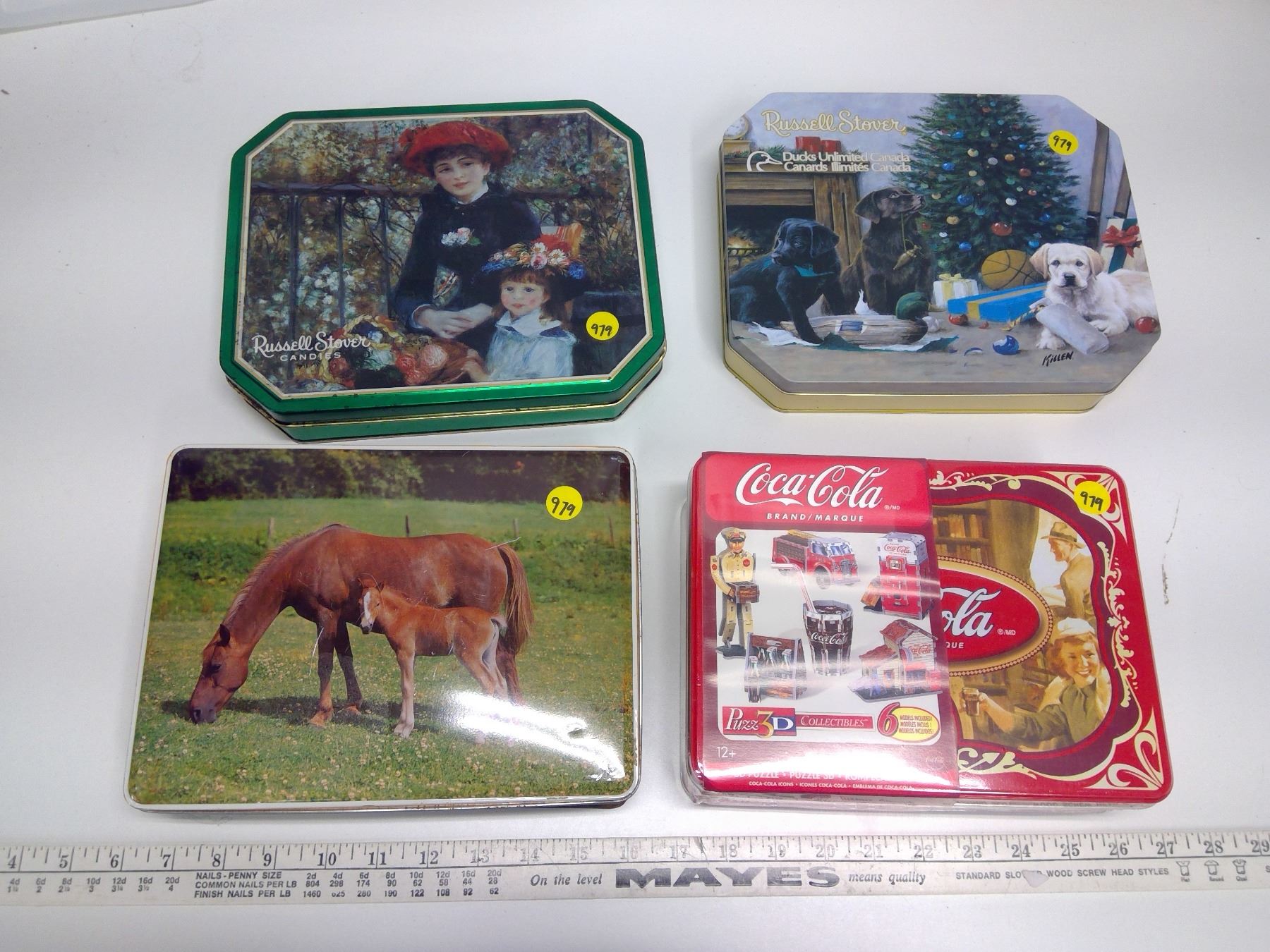 4 Rectangular Tins - Coca-Cola (Sealed), Horses, Russel Stover
