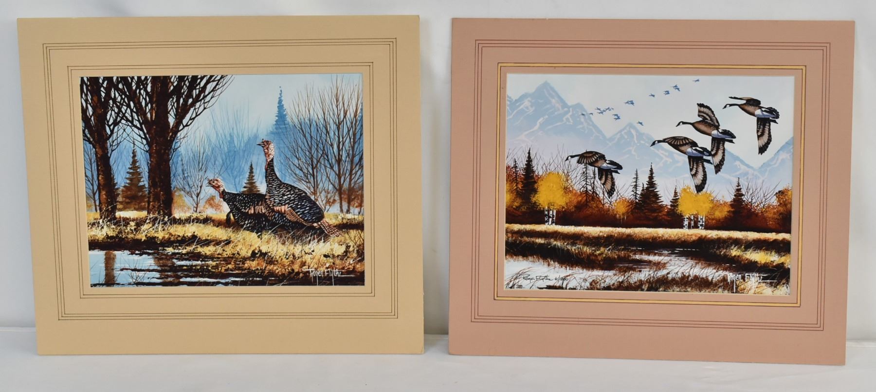 4 Roger Thomas Flythe Prints (1941-2017), largest measures 17'' x 11'', includes 1. Aspens and Geese, hand signed, #6/200 2. Turkeys 3. Buck, hand signed, #5/200 4. Eagle, hand signed, 71/400, the 3 prints that are matted are printed Kodak paper