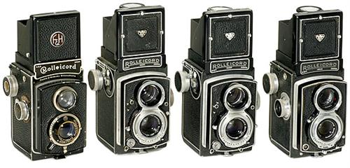 4 Rolleicord Franke & Heidecke, Braunschweig. 1) "Rolleicord II", 1936, no. 1963718, "Triotar 3,5/7,5 cm", early model without bayonet. - 2) "Rolleicord IV", 1953, no. 1375426, "Xenar 3,5/75", case. - 3) "Rolleicord Va", 1957, no. 1900629, "Xenar 3,5/75", early model, light values left side, case. - And: 4) "Rolleicord Va", 1958, no. 1930019, "Xenar 3,5/75", late model, light value right side, case.<Br>