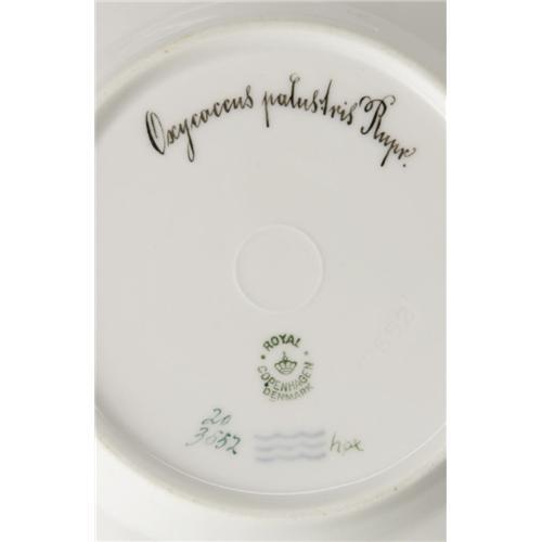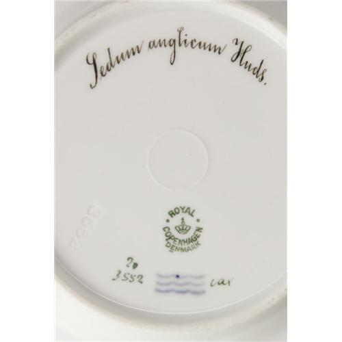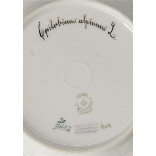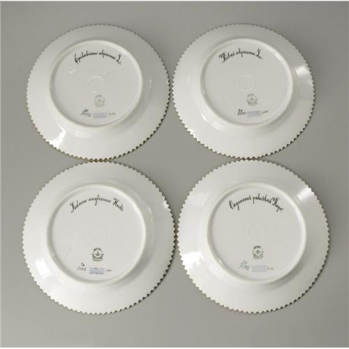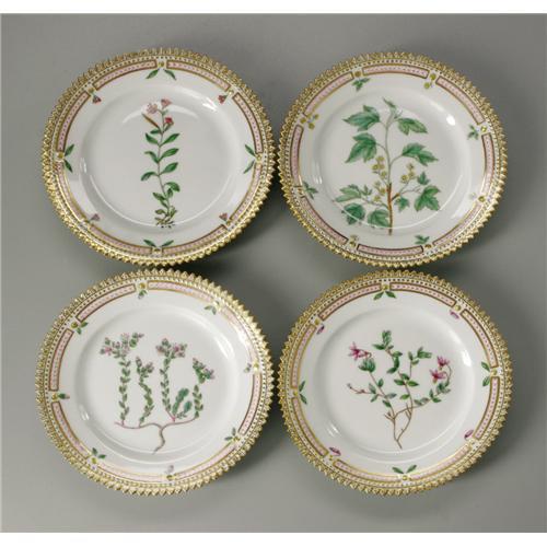 <B>Four <I>Flora Danica</B></I> Porcelain Bread And Butter Plates</B></I><BR><B>Royal Copenhagen, Mid-Twentieth Century</B></I><BR><BR>Four <I>Flora Danica</B></I> pattern bread and butter plates with raised border depicting <I>Epilobium aplinum L..</B></I> ( 1956), <I>Ribes alpinum L.</B></I> (1956), <I>Oxycoccus palustris Rupr.</B></I> (1956) and <I>sedum anglicum Huds.</B></I> (1956), pink and gilt border to the front. Maker's mark to the underside<BR>5.5in. diameter