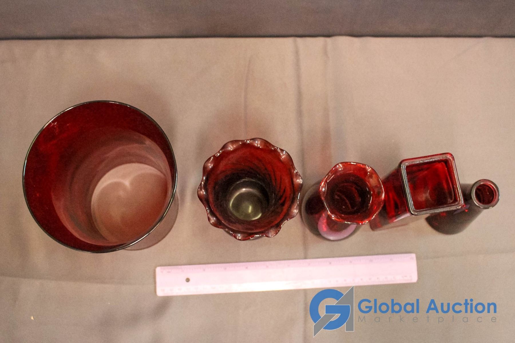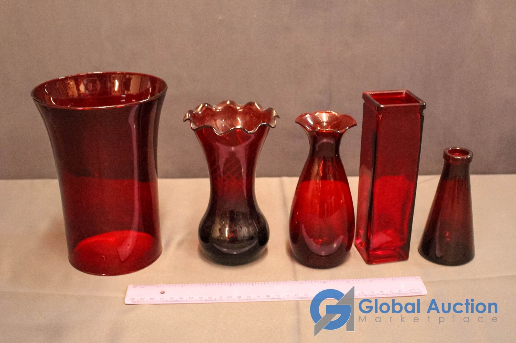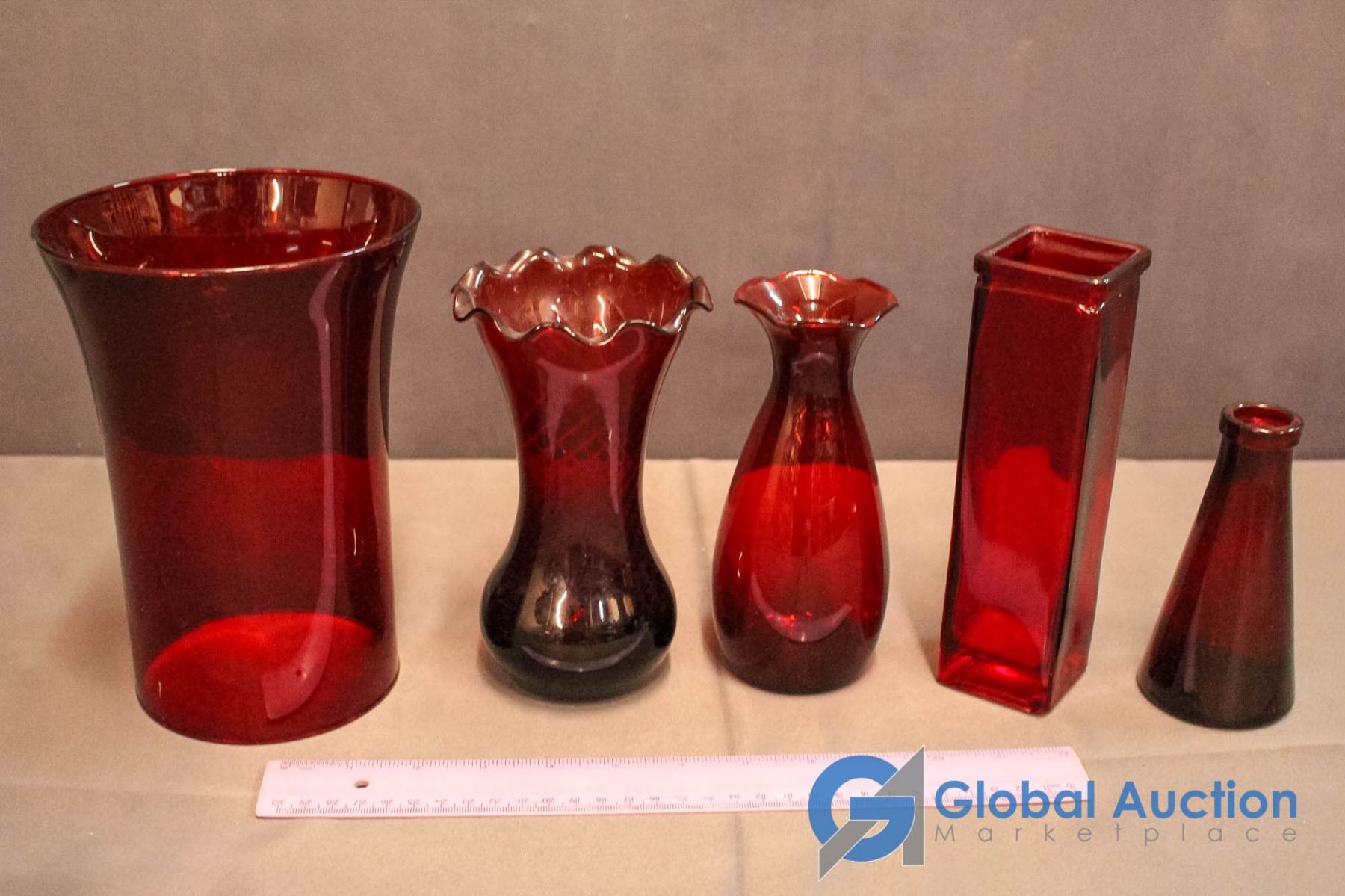 4 Ruby Red Vases & 1 Ruby Red Candle Shade