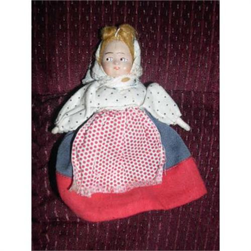 4" Russian Doll with Red Dotted Apron, Tag says Made in Soviet Union. She has composition head and yarn woven shoes. Doll comes from a smoke free environment. Buyer to pay $8 for shipping, handling, and insurance. Thanks for viewing.