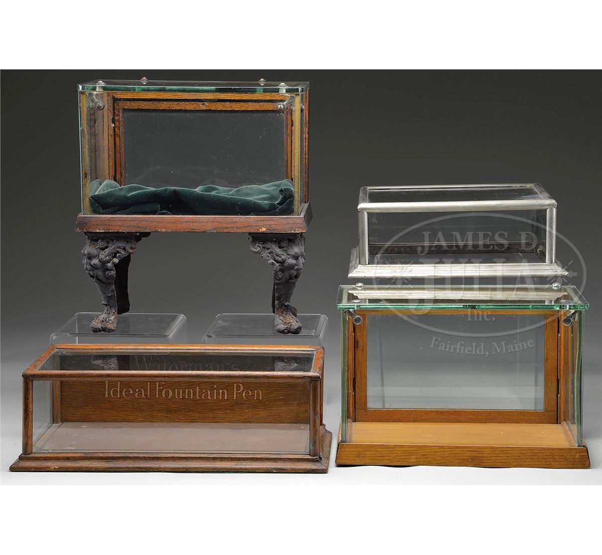 Lot includes three wood and glass examples and one glass and German silver example (lacking base). Lot is highlighted by wood and glass example on ornate cast iron legs. Other two examples have fold down backs. One is marked "Waterman's Ideal Fountain Pen". SIZE: Largest: 15" h x 13-1/2" w x 7-1/2" d. CONDITION: Overall generally good. Two cases with some replaced glass. Cast iron legs show rust and oxidation. 1-13573
