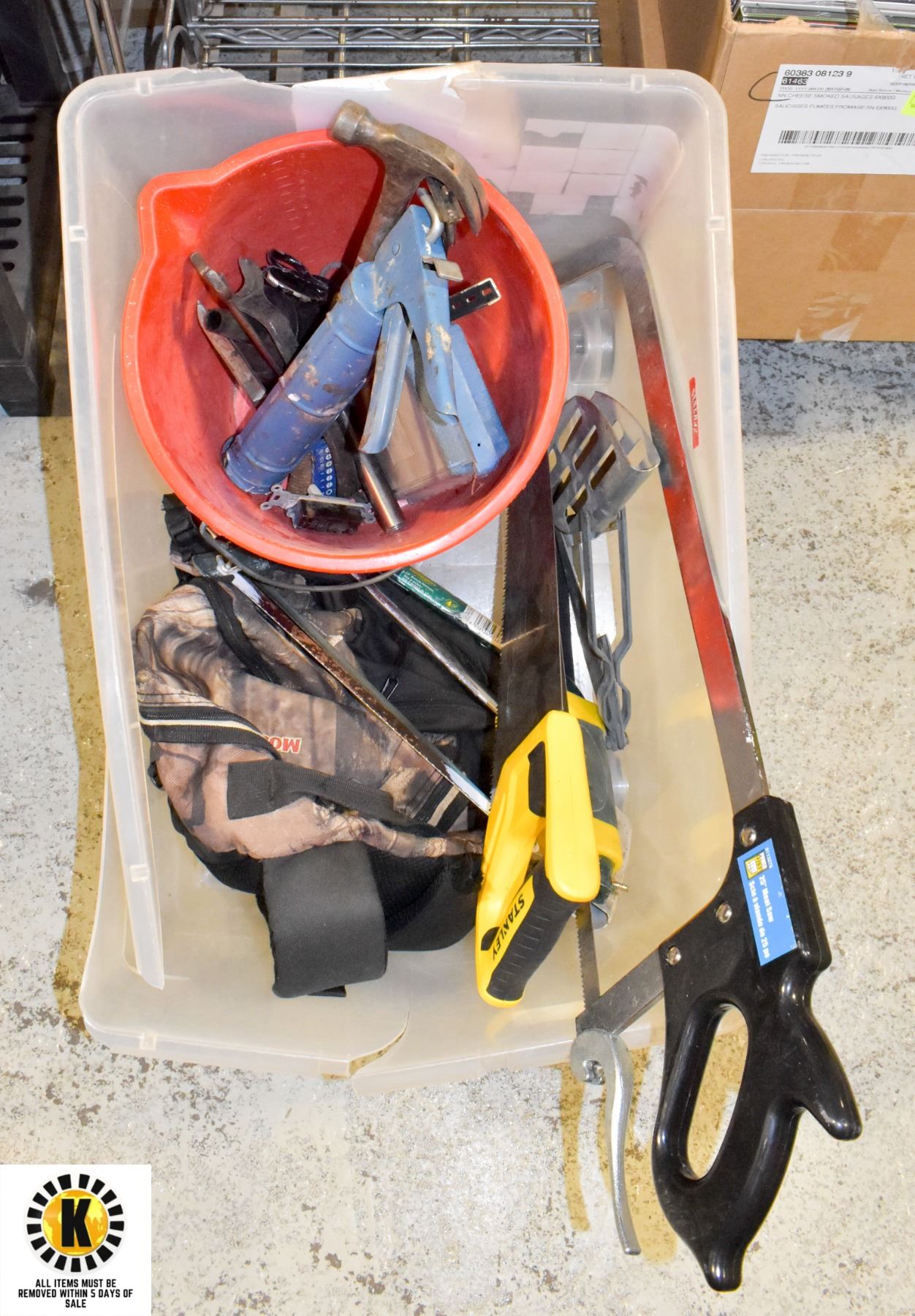 4 SAWS, HAMMER, BUCKET, AND MISC TOOLS