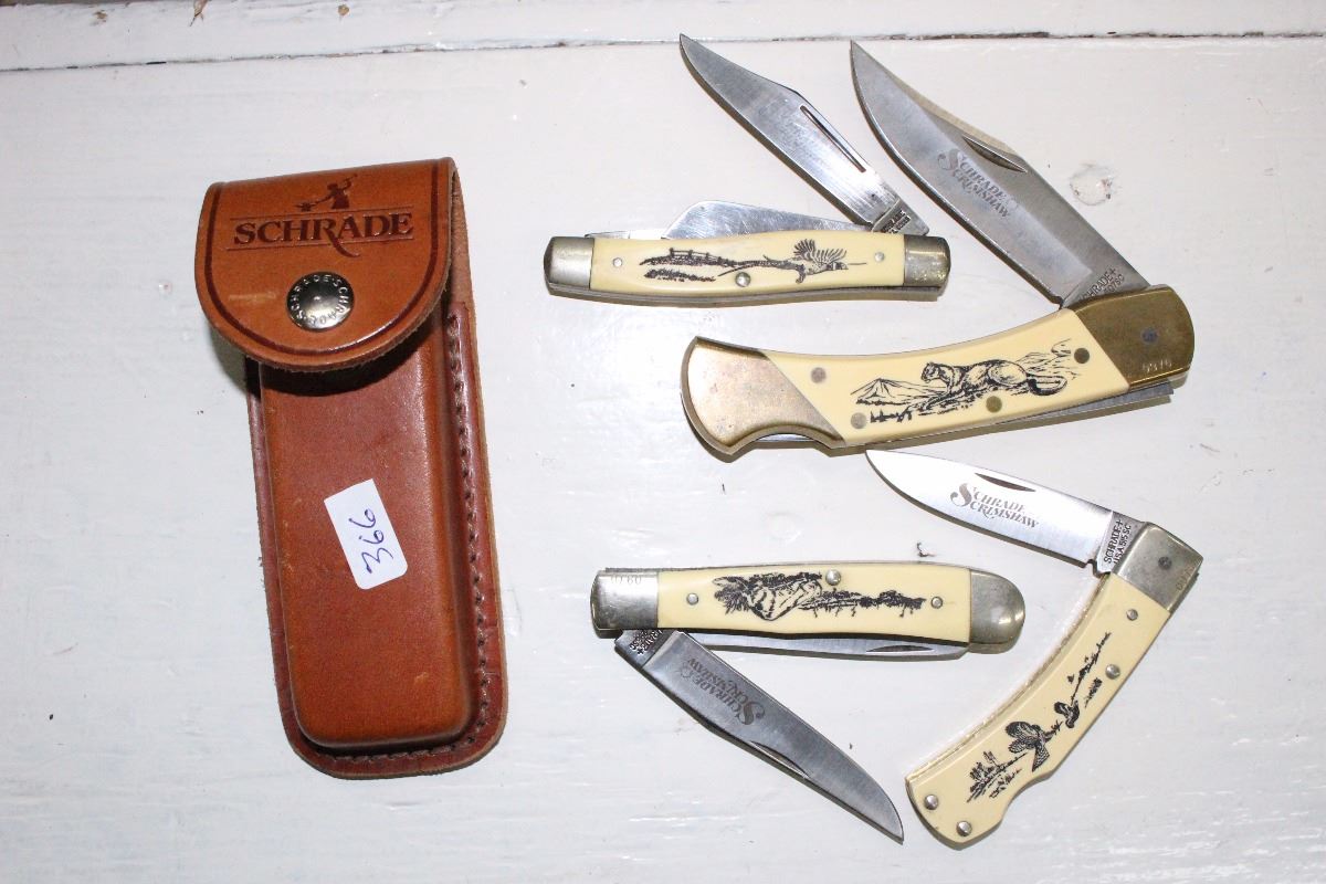 4 SCHRADE Set: 1 Blade, 2 Blade, 3 Blade & Lockblade with Sheath Marked 0976