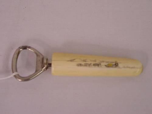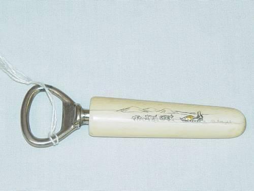 4" SCRIMSHAWED IVORY CORK SCREW CASE W/ ESKIMO SLED TEAM HIGHLIGHTED IN GOLD SIGNED ROBERT MAYKOK (?);