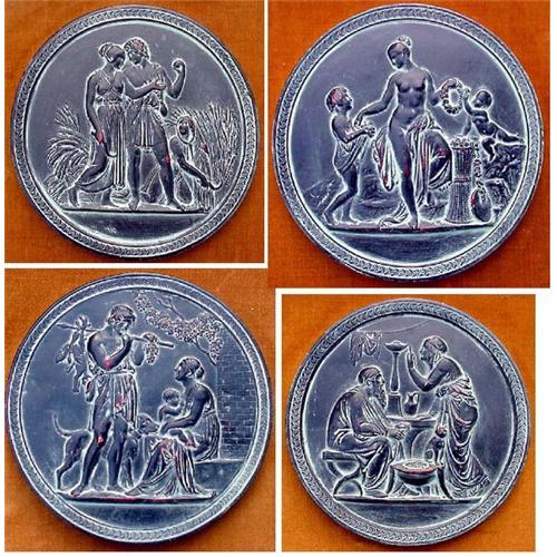 </font></strong>Wedgwood type stoneware / basalt / painted plaster as done by Wedgwood and other companies. 4 plaques, each depicting one of the 4 seasons. Magnificent allegorical carving in relief. Each measures 5 1/4inch in diameter. They are mounted in pairs on mustard velvet and framed. Wonderful detail and crisp quality to the moulding. Spring is a nubile maiden attended by putti and young boys. Wreaths and baskets of fruit lie in abandon. Summer is a pair of lovers, scythe in hand, amidst a field of corn, an older woman shears the sheathes. Each ear of corn is distinguishable and the features and folds of the clothes are fabulous. Autumn/Fall is a domestic scene: the mother with baby at her breast, man bringing home fruit and game that he has hunted and gathered. His dog at his side. Winter is depicted as an old couple warming themselves at a fire. Laundry hangs on a line and a cat hogs the best spot next to the warmth.<BR>Later information: these plaques are original designs by Bertel Thorvaldsen. A 19th century Danish sculptor considered on par with Canova. So no surprise they are by Royal Copenhagen.</font>