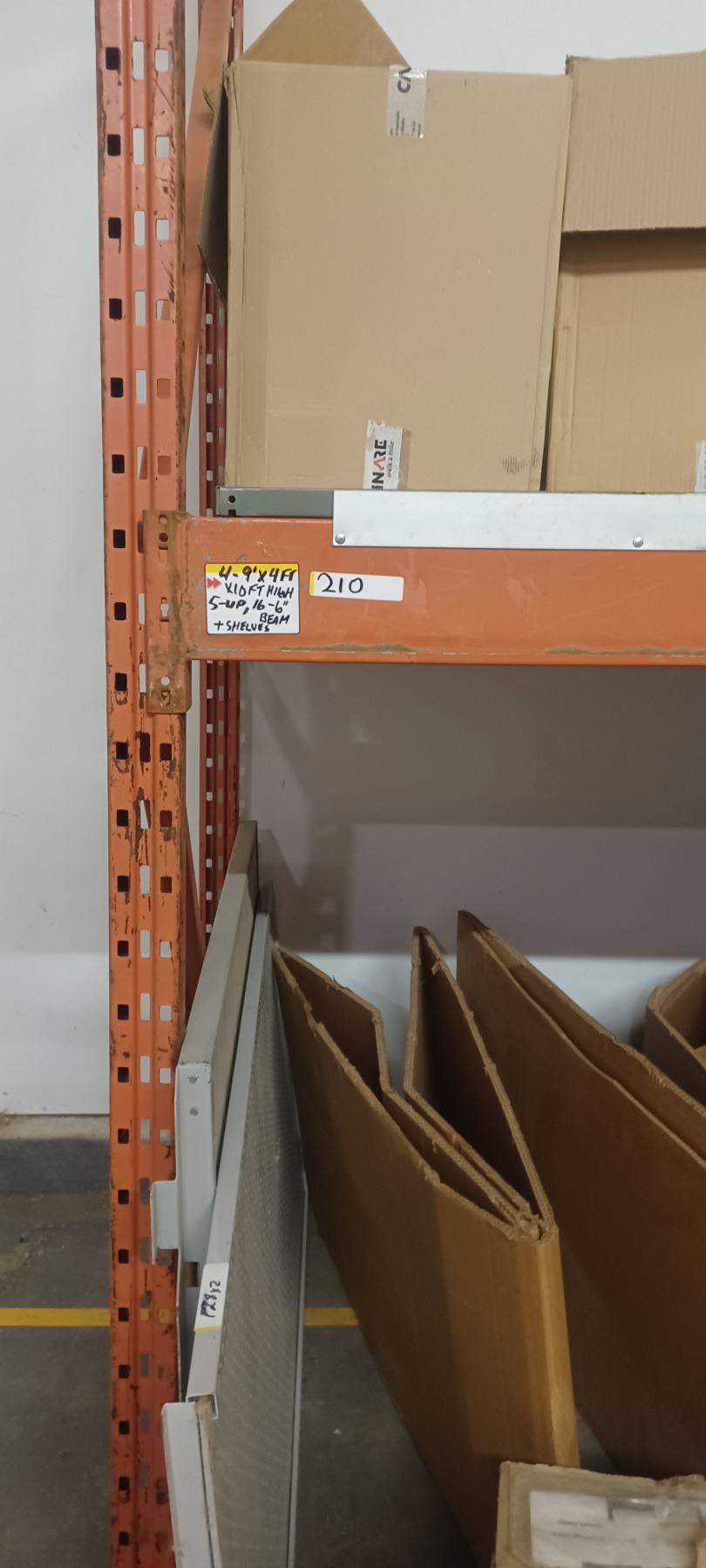 4 SECTIONS OF 10 FT H X 8 FT L X 42" W PALLET RACKING C/W 5 UPRIGHTS, 16 - 6" BEAMS AND SHELVING