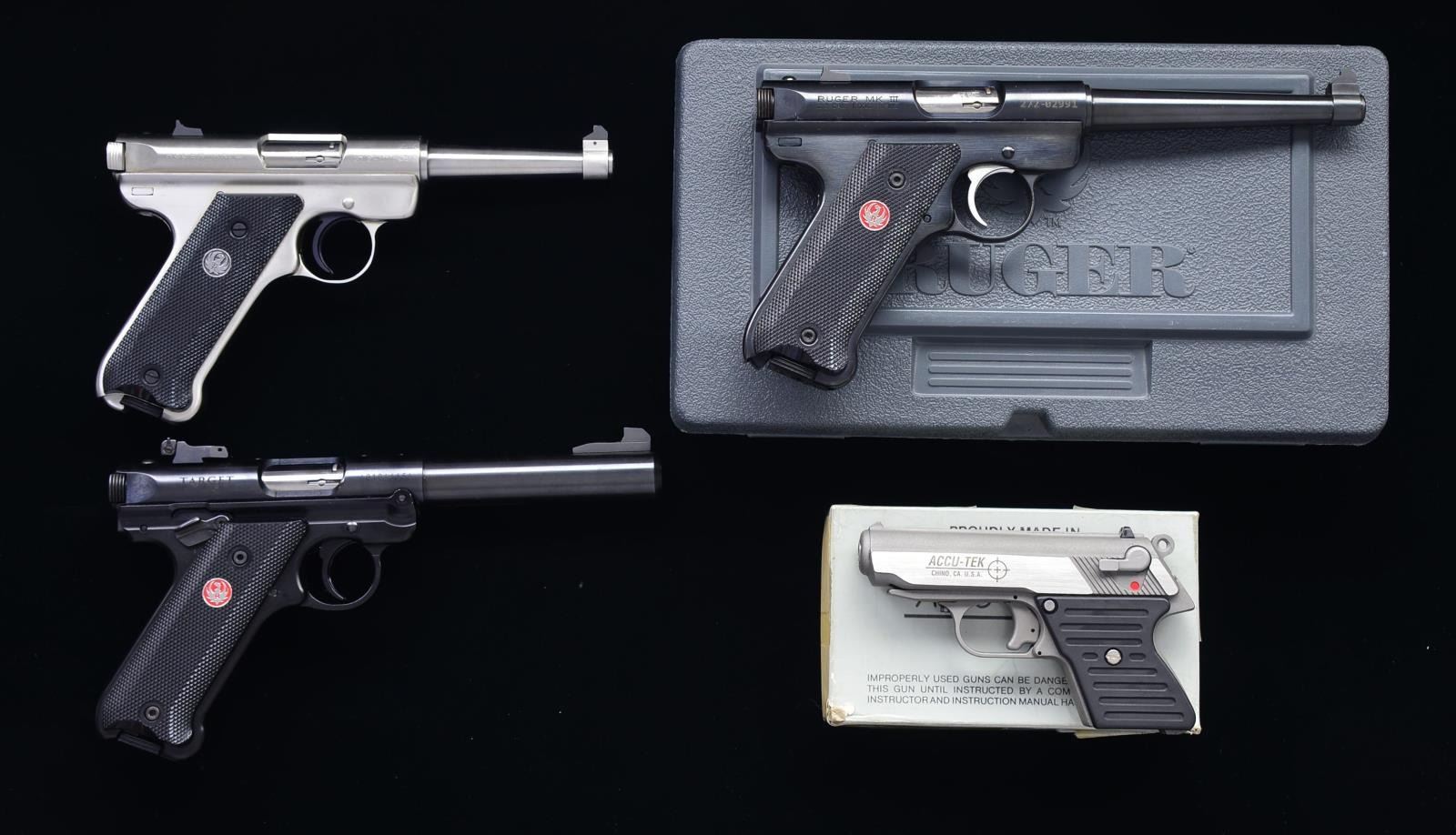 RUGER STANDARDS, INCLUDING A MARK IV TARGET. 1) ACCU-TEK MODEL AT-380 STAINLESS STEEL. Cal. 380 ACP. S# 023452. Bbl. 2 5/8". Single action. All stainless steel slide & frame. Black hard rubber grips. MAGS: 1- 6 shot w/ black plastic finger extension. UNATTACHED ACCESSORIES: in its original box w/ paperwork. CONDITION: close to new w/ some slight marks & scratches mostly on right side of slide & operation marks on bbl. Fine bore, mechanically good. (20-3654/MGM). 2) RUGER MARK IV TARGET. Cal. 22 LR. S# 401046654. Bbl. 5 1/2" bull. Newly designed w/ 1 button take down system & aluminum frame. Target sights. Top of receiver drilled & tapped for scope. Black plastic grips w/ Ruger red hawk medallions. MAGS: 1- 10 rd. CONDITION: shows minimal use. Cosmetically very fine w/ only a few very light marks. Very fine bore. (20-3722/MGM). 3) RUGER STANDARD MARK II, STAINLESS STEEL. Cal. 22 LR. S# 212-17949. Bbl. 2 3/4". Fixed sights. Black plastic grips w/ black Ruger medallion. CONDITION: shows moderate use & w/ a few scuffs & marks on stainless finish. Very fine bore. (20-3723/MGM). 4) RUGER STANDARD MARK III W/ BOX. Cal. 22 LR. S# 272-02991. Bbl. 6". Fixed sights. Blued finish. Black plastic grips w/ red Ruger medallions. MAGS: 1- 10 rd. UNATTACHED ACCESSORIES: plastic box matching pistol w/ paperwork. CONDITION: evidence of some firing, but very close to “as new” w/ only a few very light handling marks in all surfaces. Bright bore, mechanically crisp. (20-3724/MGM). ALL MODERN. $800-1,200.