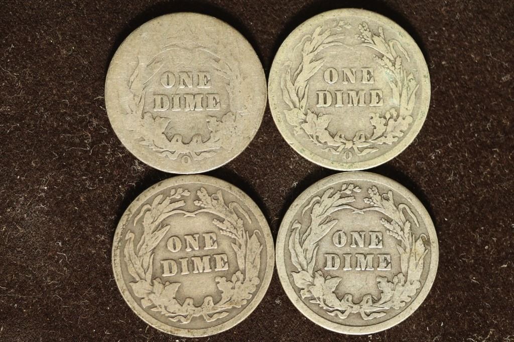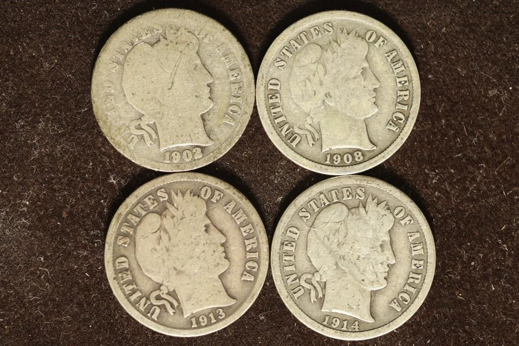 4-SILVER BARBER DIMES: 1902-O, 1908-O, 13 & 1914
