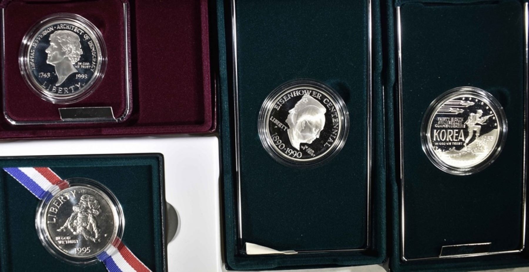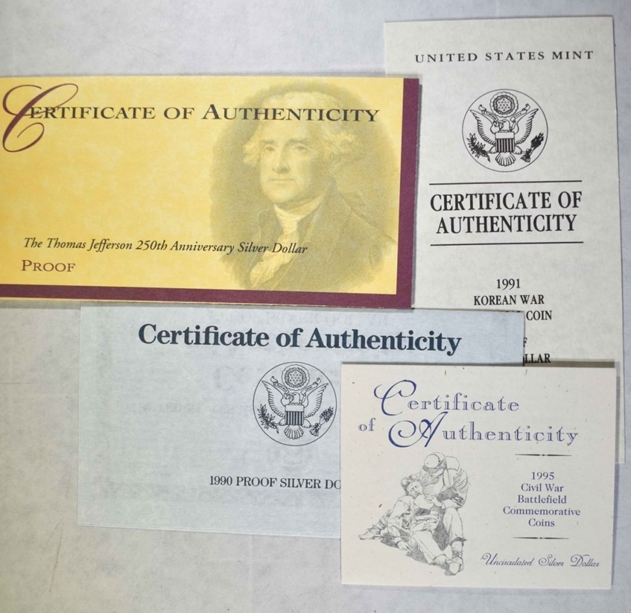 1990 PROOF EISENHOWER, 1991 PROOF KOREAN WAR,  1993 PROOF THOMAS JEFFERSON, 1995 UNC CIVIL  WAR W/BOX AND COA'S  ESTIMATE $150 - $155.