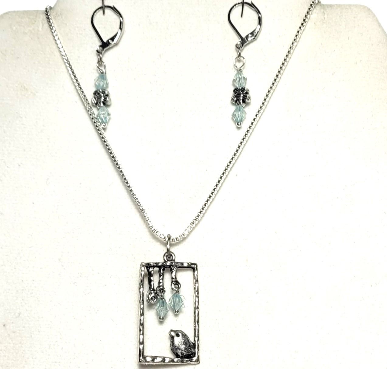 CRYSTAL DROP EARRINGS AND COORDINATING PENDANT WITH A BIRD FEATURE ON AN 18" BOX LINK CHAIN. JEWELLERY
