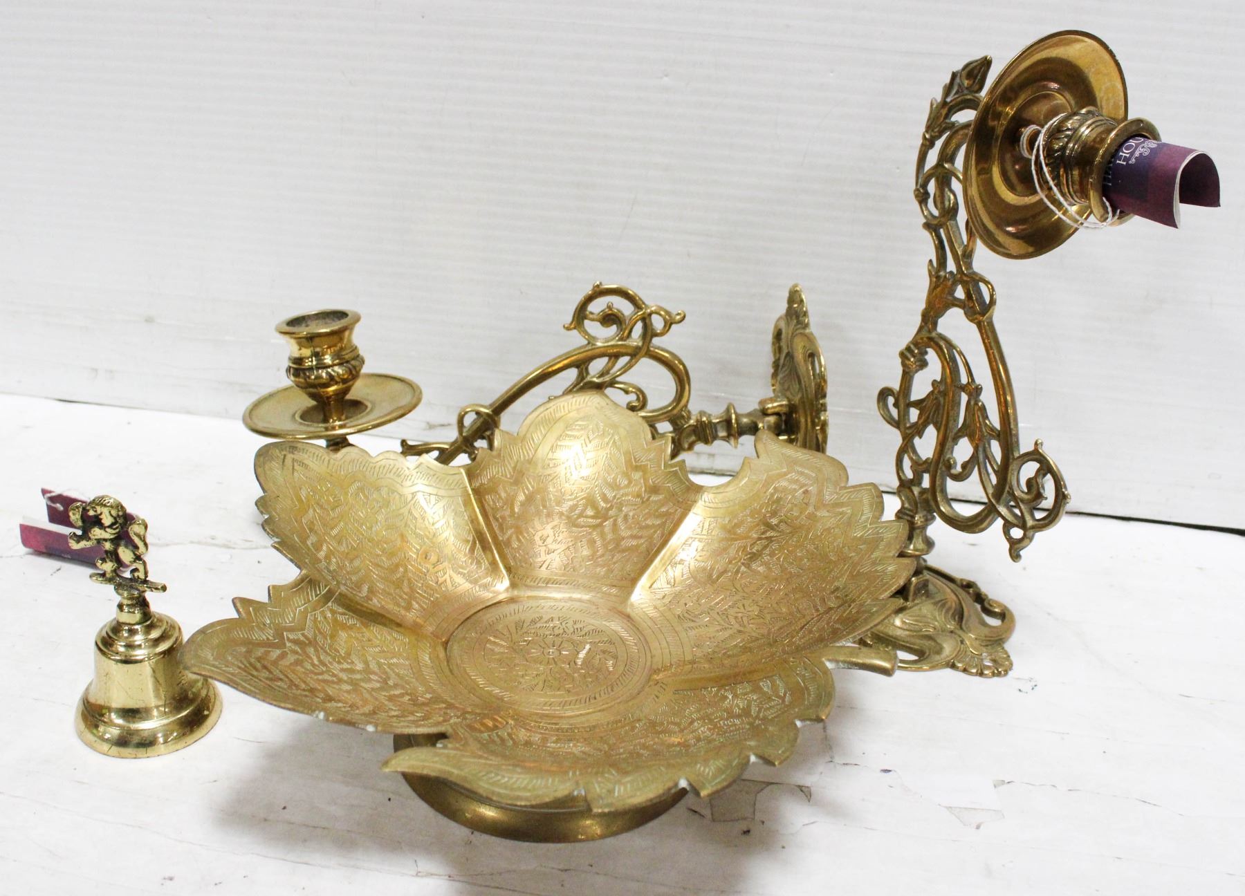 4 SMALL BRASS DECOR PIECES: BELL, DISH, 2 CANDLE-