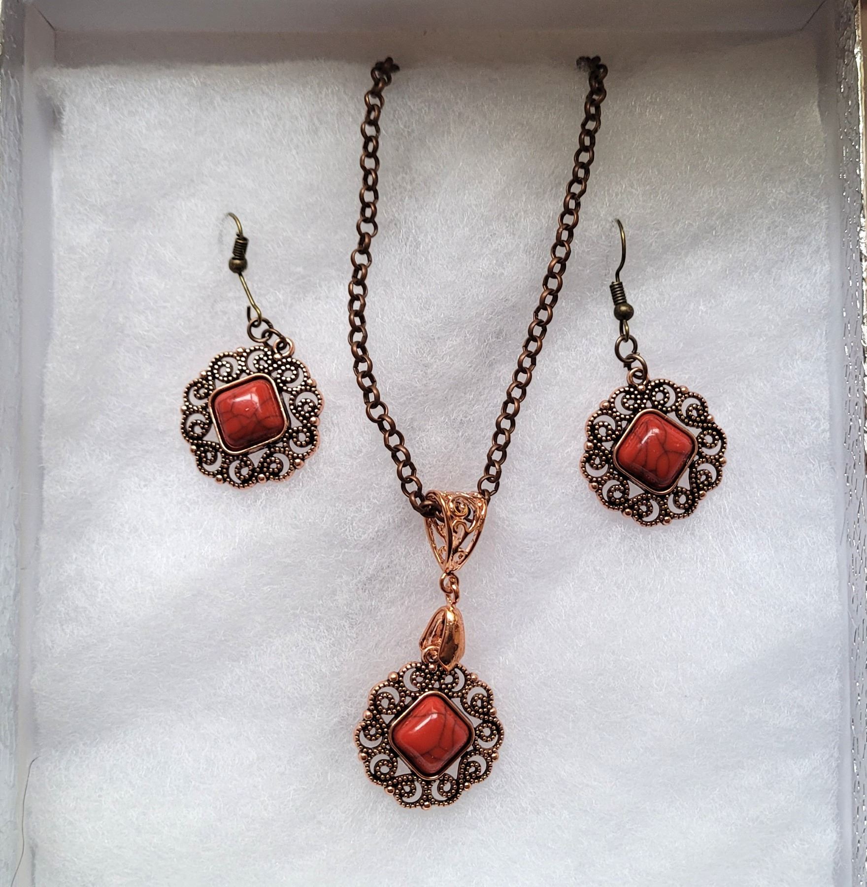 COPPER PENDANT ON 20" CHAIN AND MATCHING DROP EARRINGS. JEWELERY