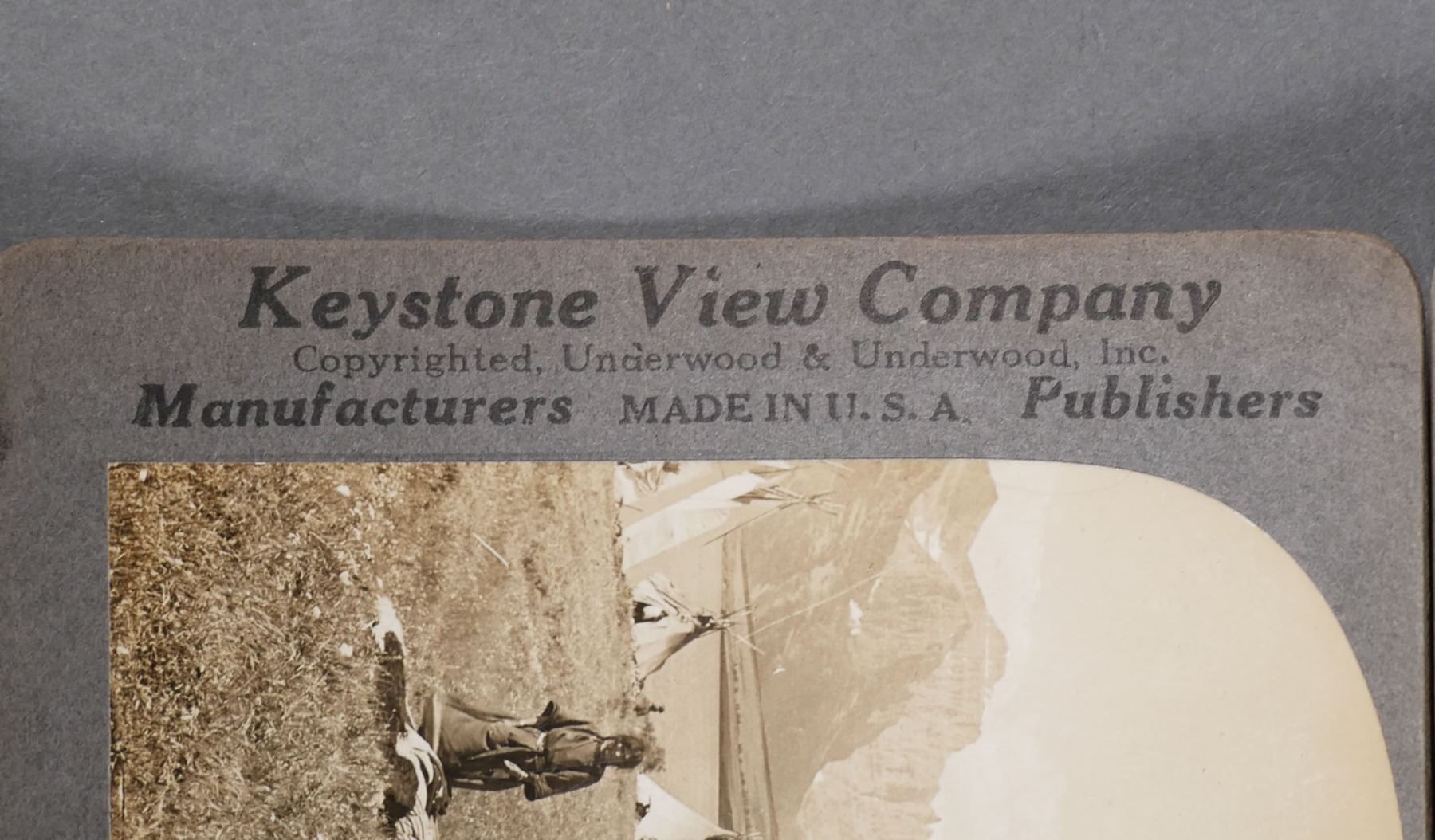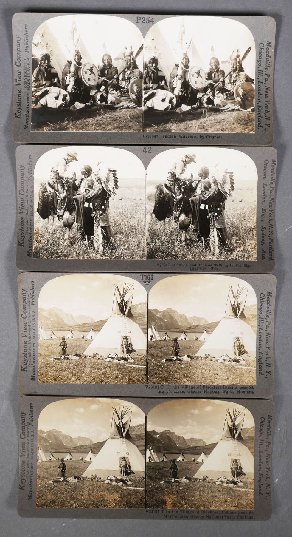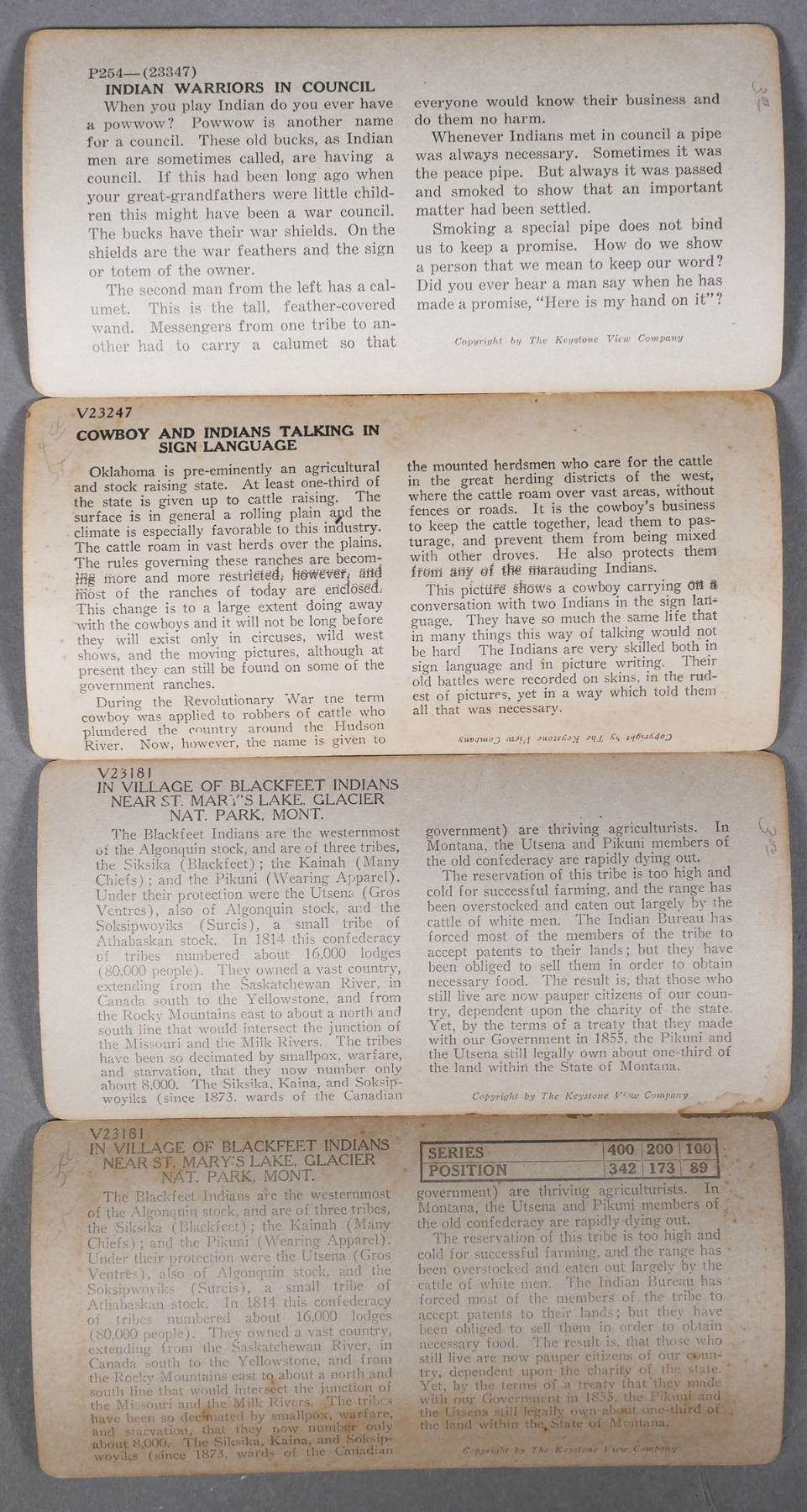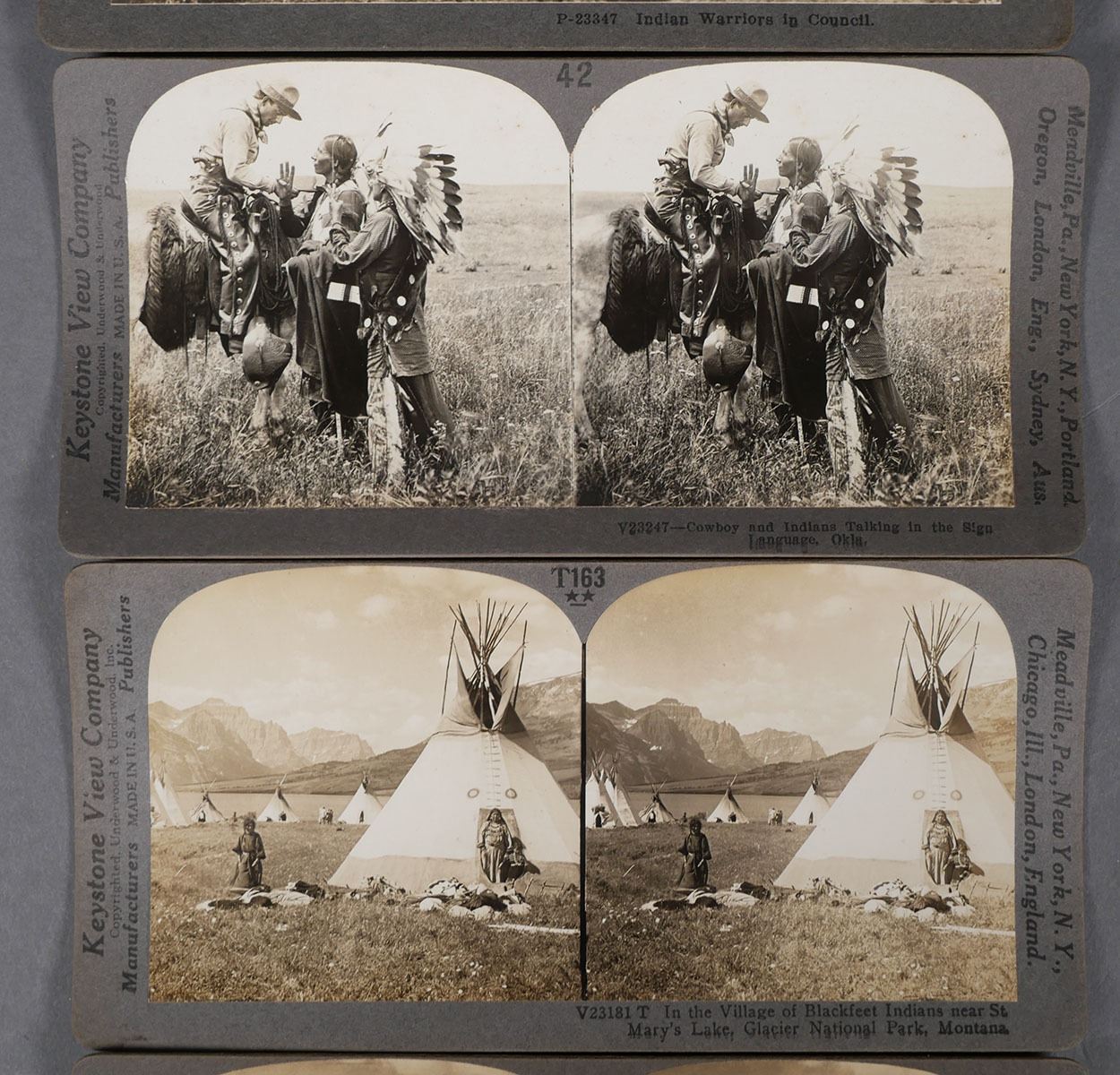 (4) Keystone View Company stereoview photos of Native Americans. (2) photos (duplicate) of Blackfeet Indians village near St. Mary's Lake, Glacier National Park, Montana. (1) photo of Indian warriors in council and (1) photo of cowboy & Indians talking in sign language. All are in very good condition with no rips, tears or photo loss. One photo has a bit of paper loss on the back corner, all photos have old prices written in pencil on backs. See photos for more details on condition. Dimensions: 3 3/8" x 7".