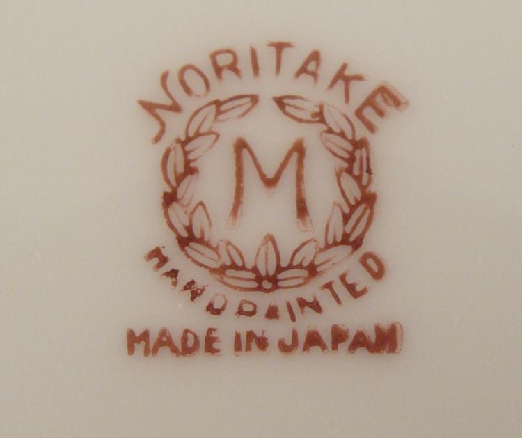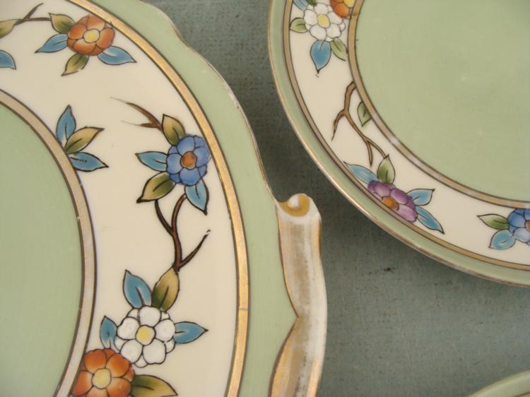 This group of Noritake includes 4 saucers and one tray, all with a lovely enameled floral motif, and gold trim. * Condition: Very good- some wear on the gold Size of dishes/saucers: 6" diameter Size of platter/tray: 10 1/2" diameter Green plates with flowers on them Makers mark on bottom Made by Noritake Hand painted Made in Japan There are 4 dishes/saucers and 1 large tray