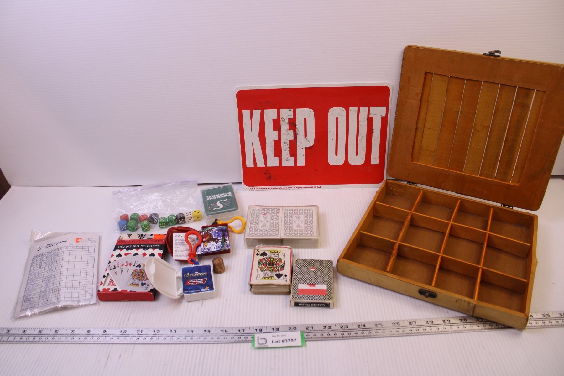 (4) Sets of Cards (Including Roughrider), Dice, Storage Box and Sign