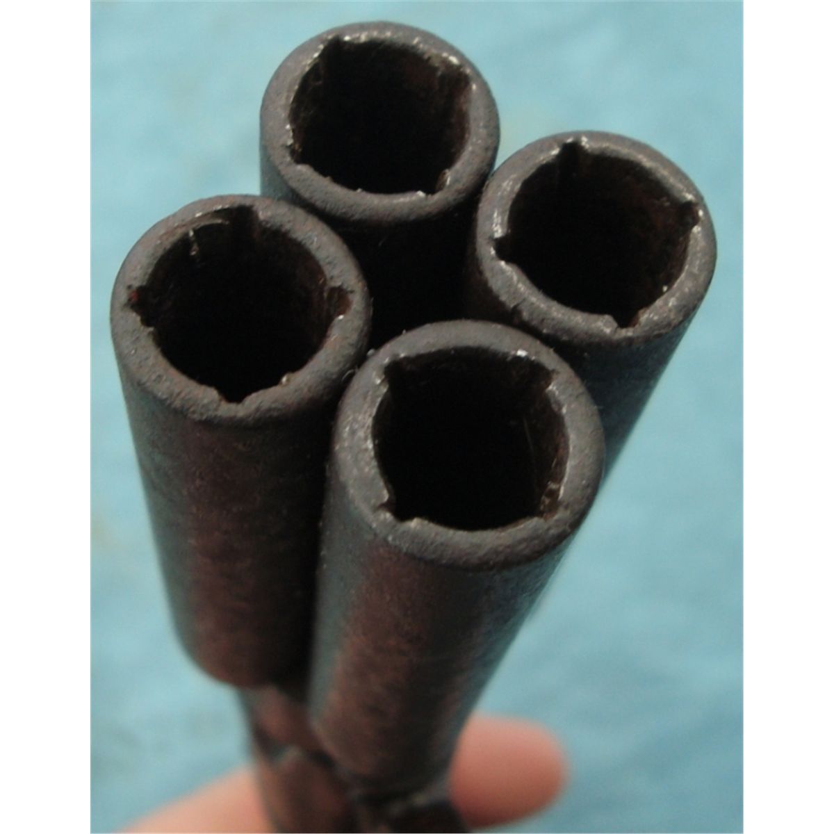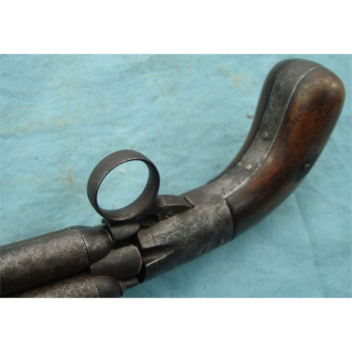 Antique 4 Shot w/approx. 36 cal. bores. Damascus bbls, wood grips & Belgium proofed. One nipple is missing, otherwise gun seems to function fine.