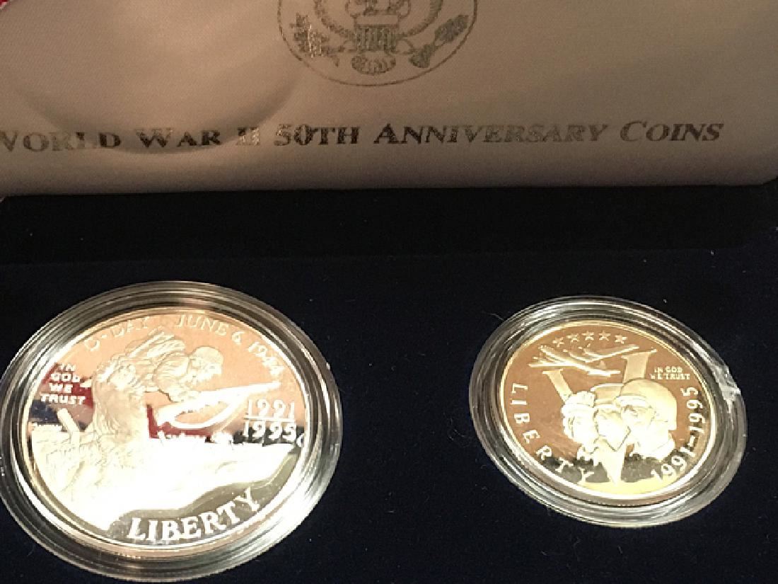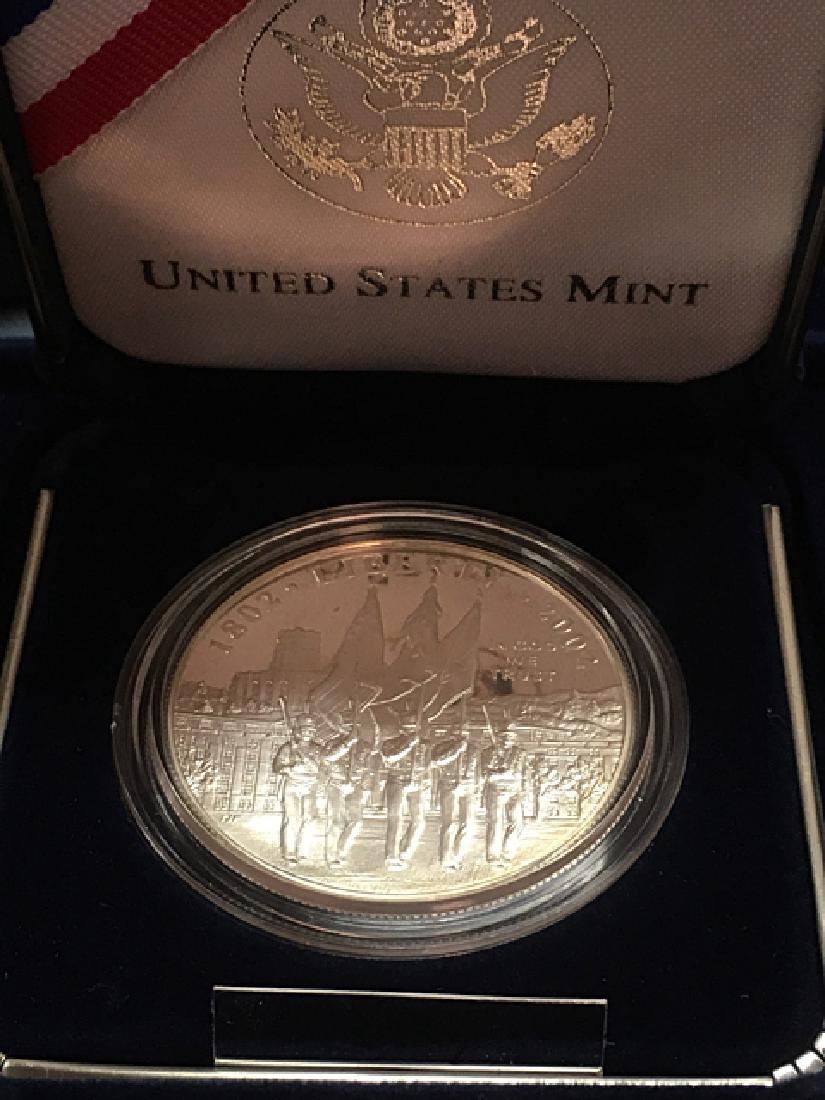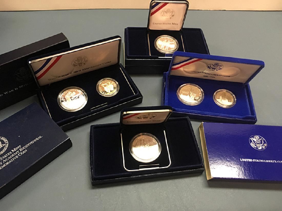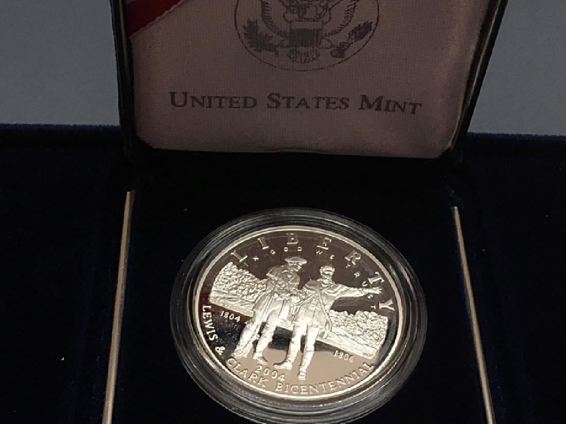 4 Silver Commemorative Proof Sets including 2004 Lewis and Clark Bicentennial, 2002 US Military Academy Bicentennial, World War II Anniversary Dollar and Half Dollar, 1886-1986 Liberty Proof Dollar and Half Dollar Coins