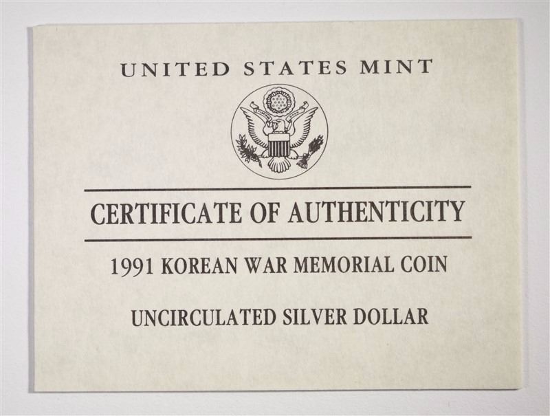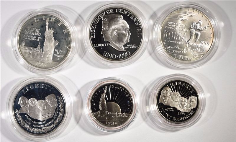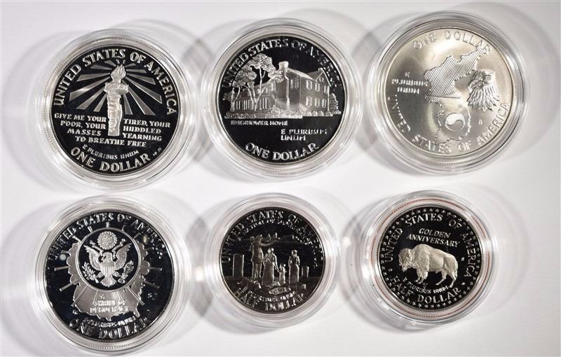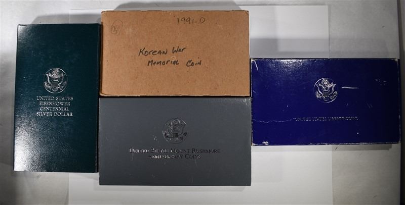 4- Silver Commemorative Silver Dollars - 1991 Korean War Unc Silver Dollar, 1986 Liberty Two Coin Set, 1991 Mount Rushmore Two Coin Set, 1990 Eisenhower Proof Silver Dollar. ESTIMATE $115 - $130.