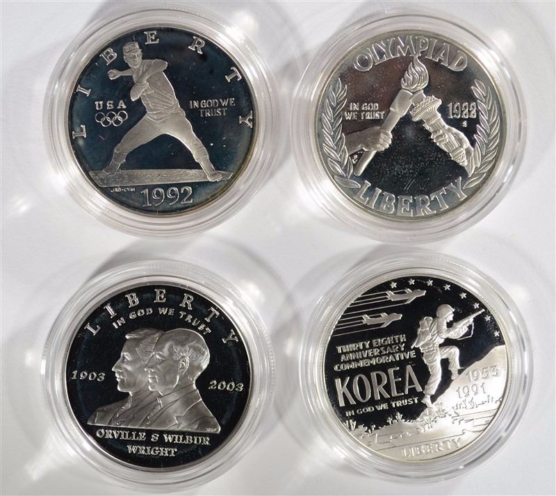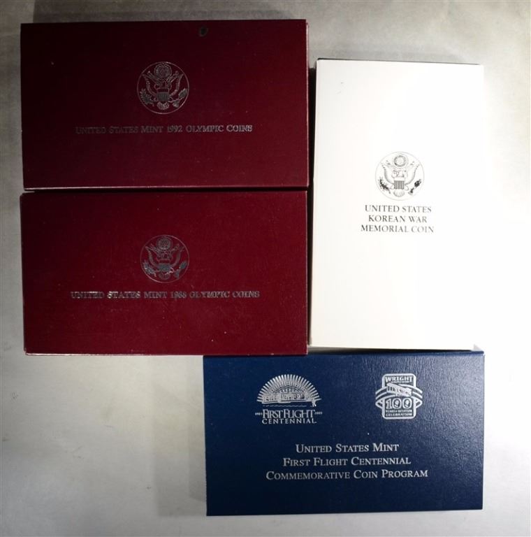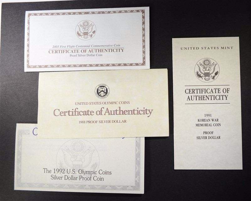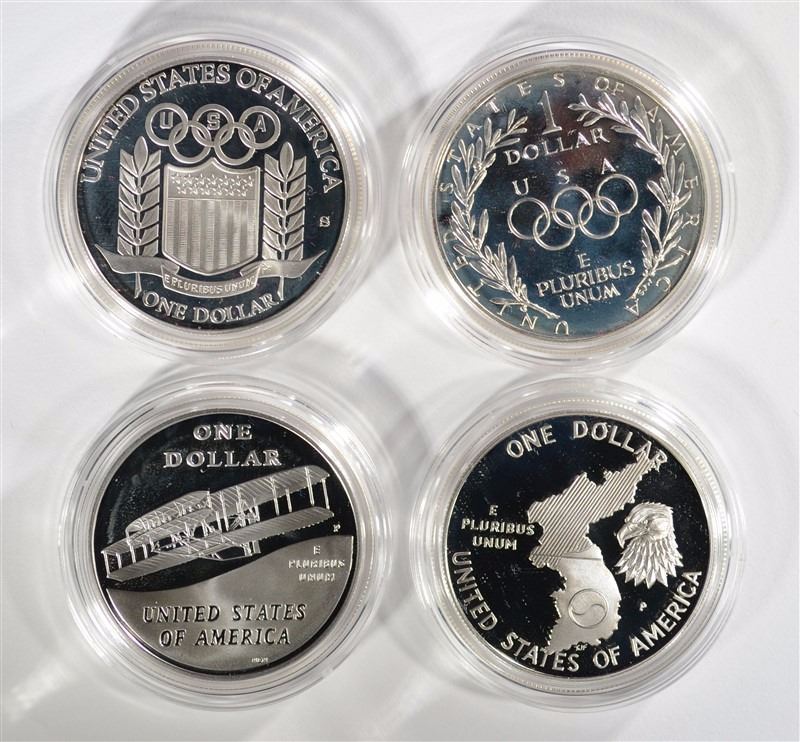 Group of 4 Commemorative Sets - 1992 Olympic Proof Silver Dollar, 1988 Olympic Proof Silver Dollar, 2003 First Flight Proof Silver Dollar, 1991 Korean War Proof Silver Dollar