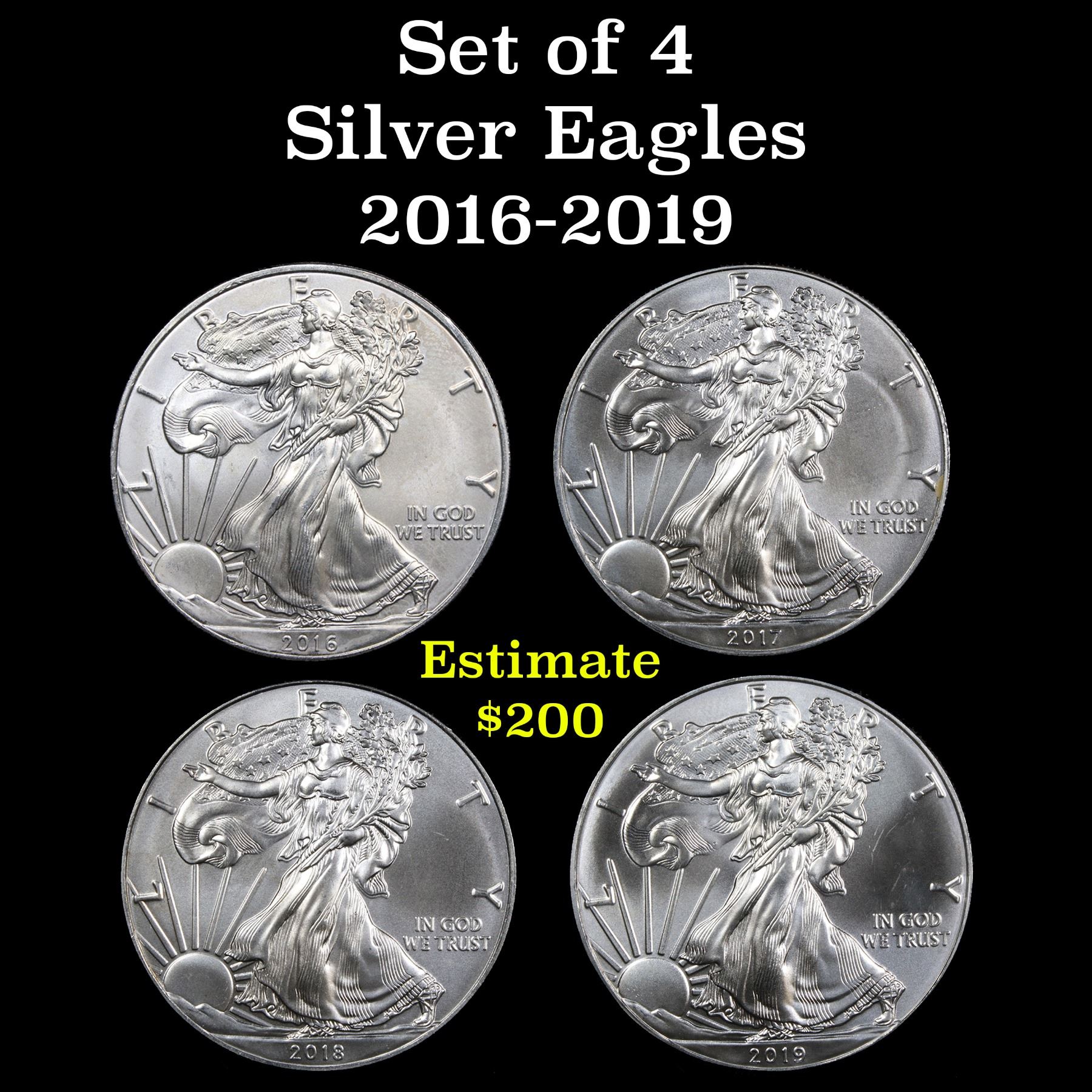 4 Silver Eagle $1 coins 2016-2019. This lot is for four (4) Gem+ Silver Eagles. Years 2016-2019.