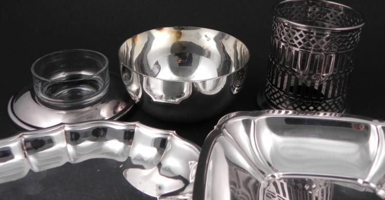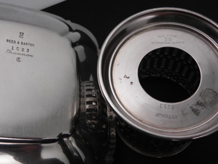 These four silver plated pieces are all for fine table service. All are in very good condition, with minimal wear. * Included are: * * Rogers Silver Co. plate, 6 x 7 inches * Reed & Barton bowl, 1023 Shannon pattern, 6 1/2 inches * Wilcox Internation Silver Co. ketchup bottle holder, number 6153, 2 3/4 inches inner diameter * Unmarked 3 piece candle holder with glass top, 3 1/2 x 4 1/2 inches * * * This is a nice little variety for some elegance at your table.