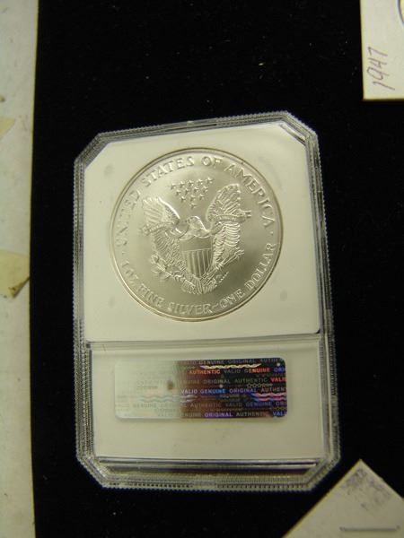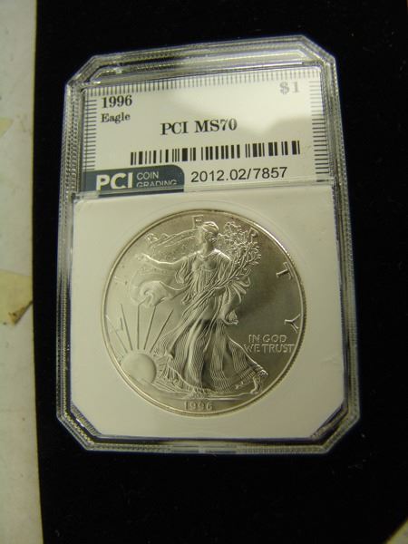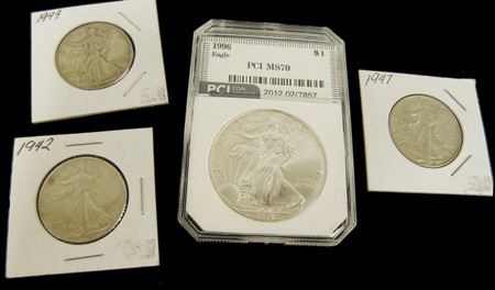 Various Ages, Includes a "perfect" 1996 Eagle dollar, PC1 MS70, and three circulated Walking Liberty silver half dollars from 1942, 1944, and 1947. Good condition. Standard size
