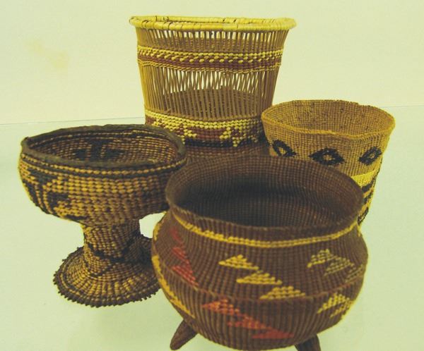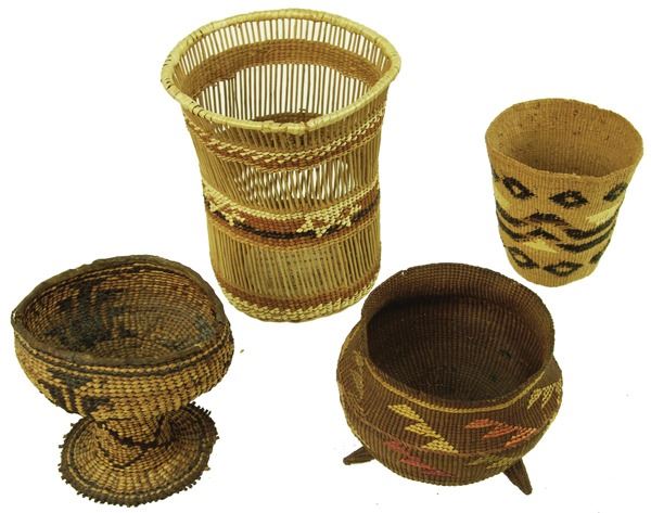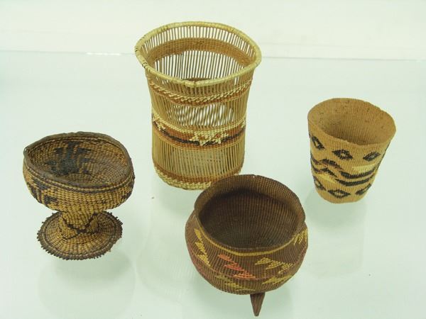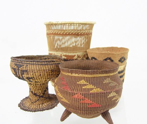 All great examples in good/very good condition including a pit river pedestal, a Hupa open work cylinder, rare Tlingit kettle, and fine Tlingit cylinder.Early/Mid 1900sTallest 6-1/2"