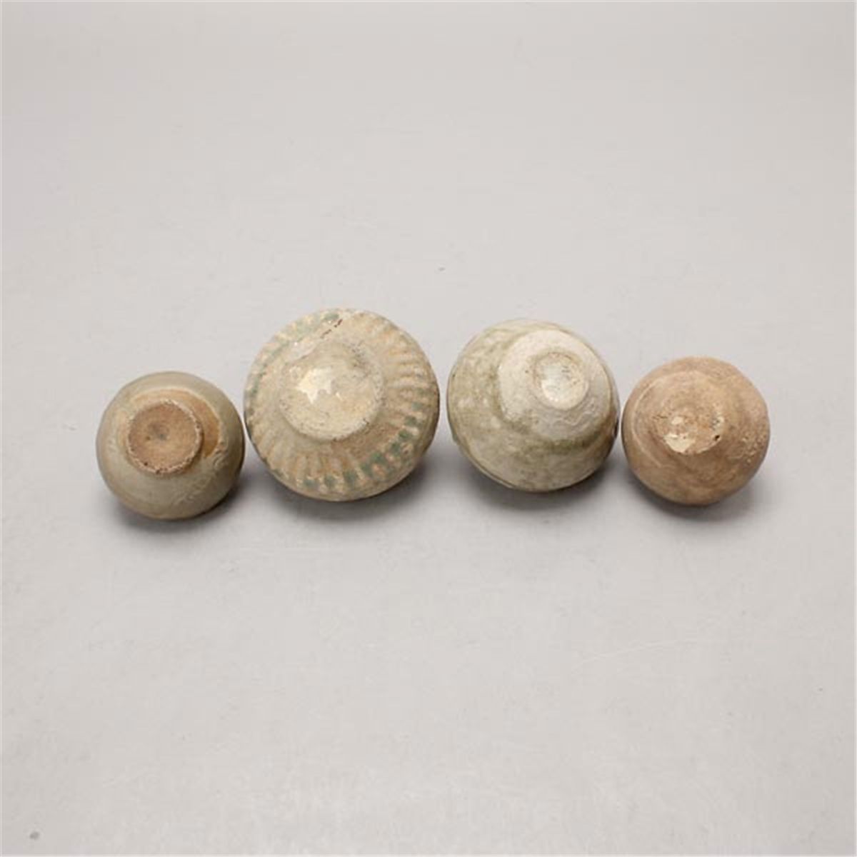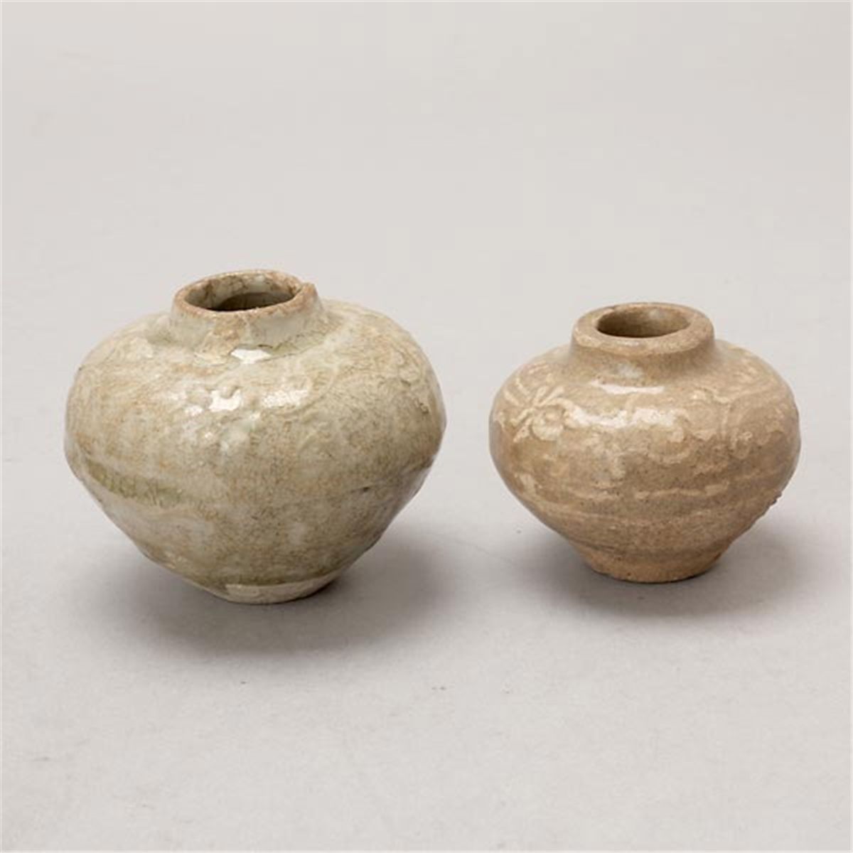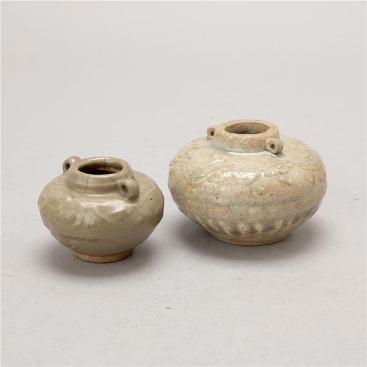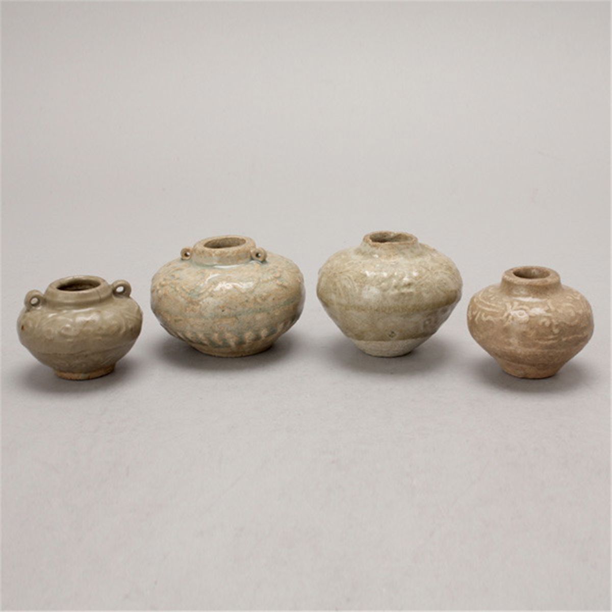 Four Small Glazed Chinese and Southeast Asian Jarlets, 14th to 16th Century, each of globular shape with molded decoration, covered in a thick celadon glaze {Tallest: 2 1/2 inches (6.4 cm)}