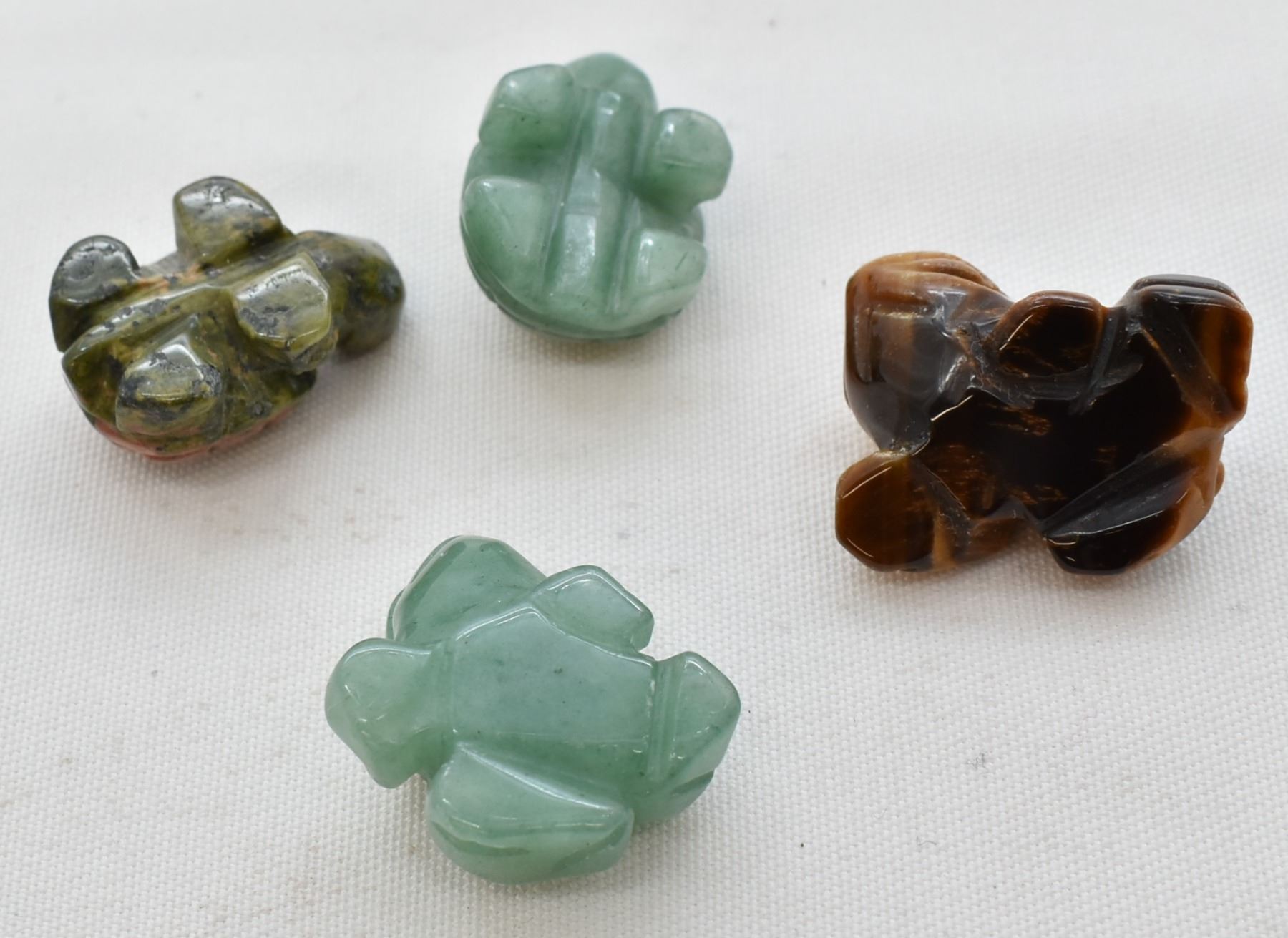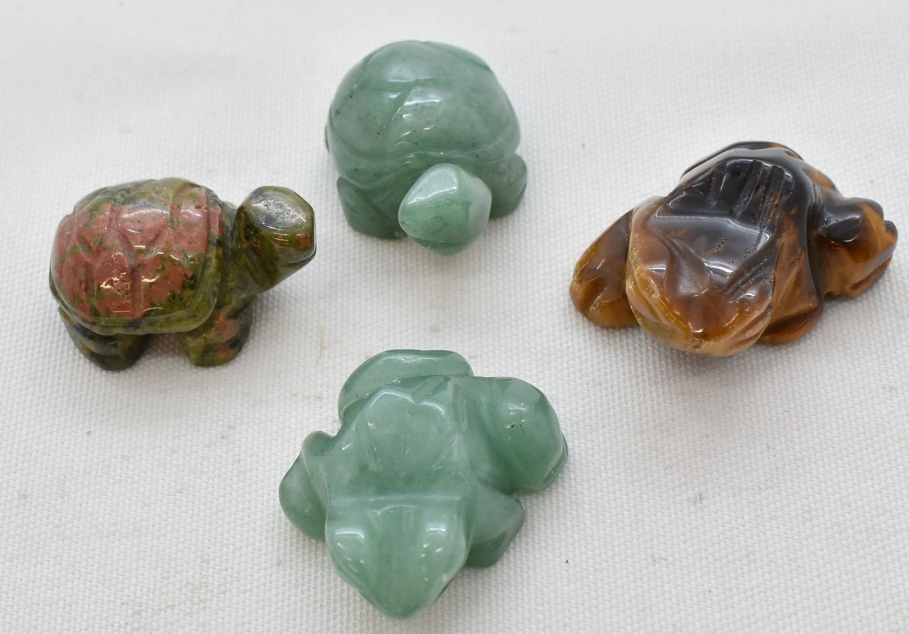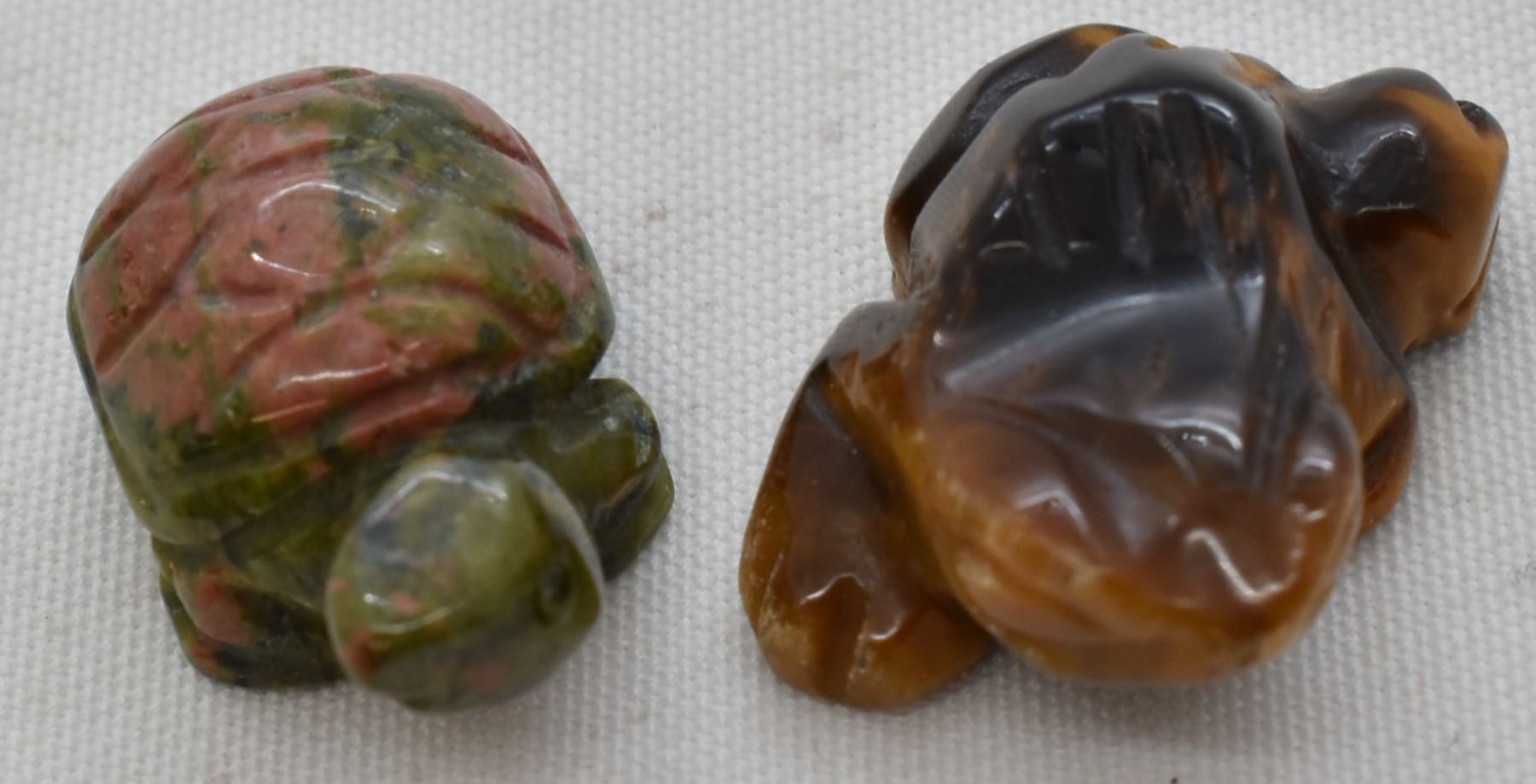 4 Small Stone Animal Carvings, includes Aventurine Frog, Tiger's Eye Frog, Aventurine Tortoise, and Unakite Tortoise, measure 1''L