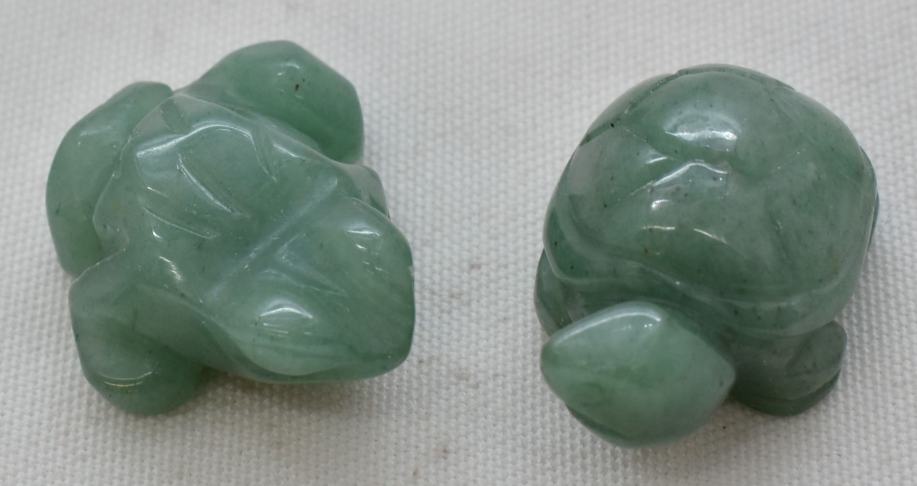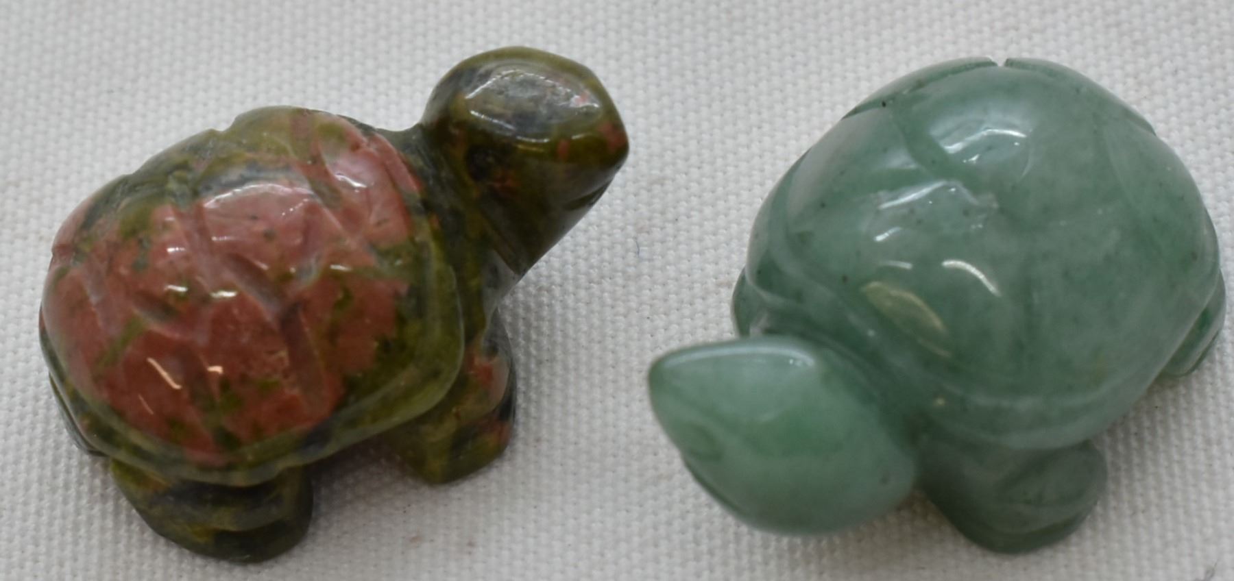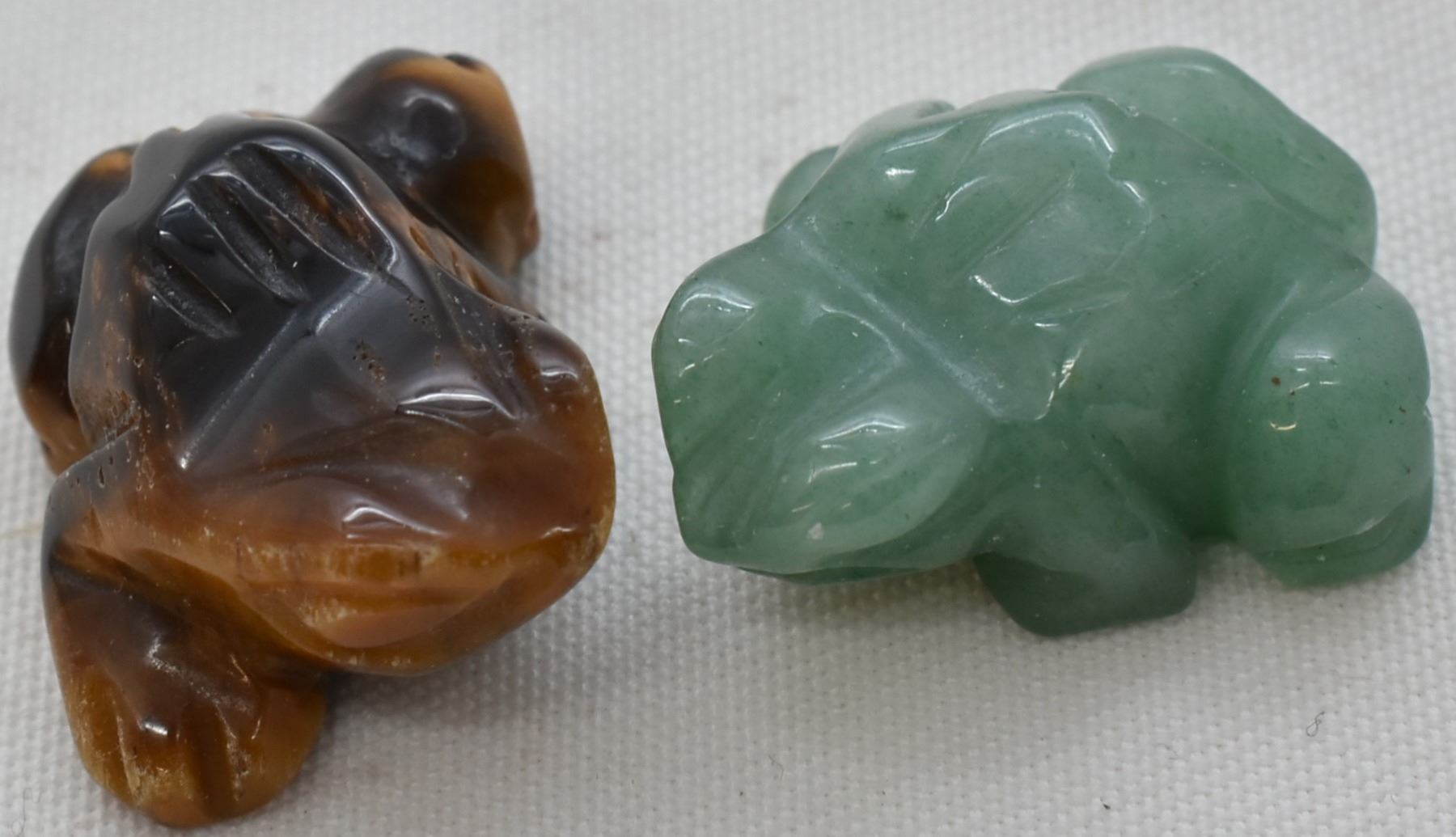 4 Small Stone Animal Carvings, includes Aventurine Frog, Tiger's Eye Frog, Aventurine Tortoise, and Unakite Tortoise, measure 1''L