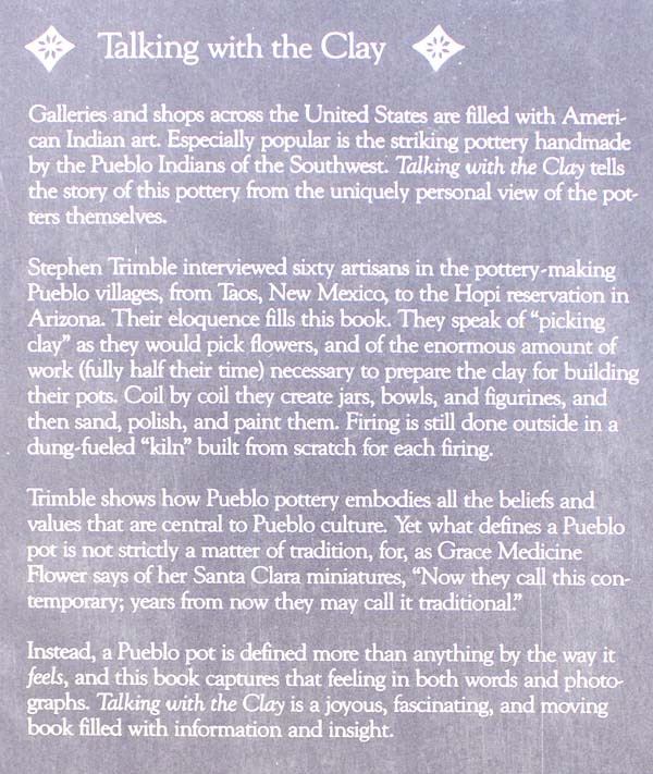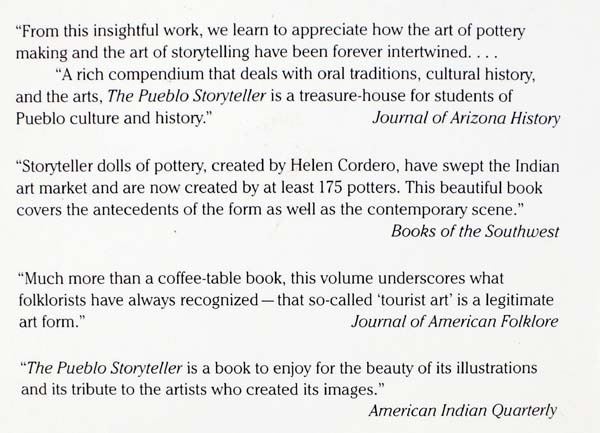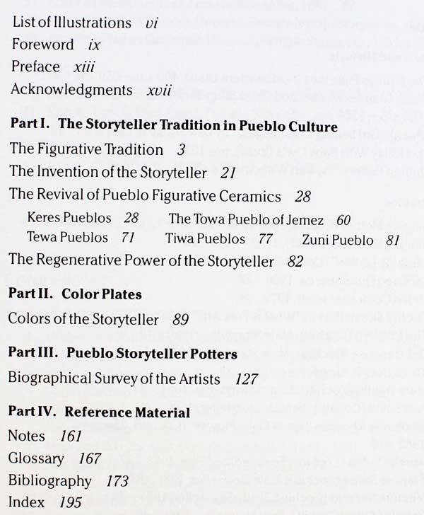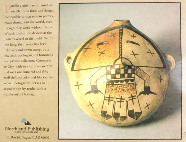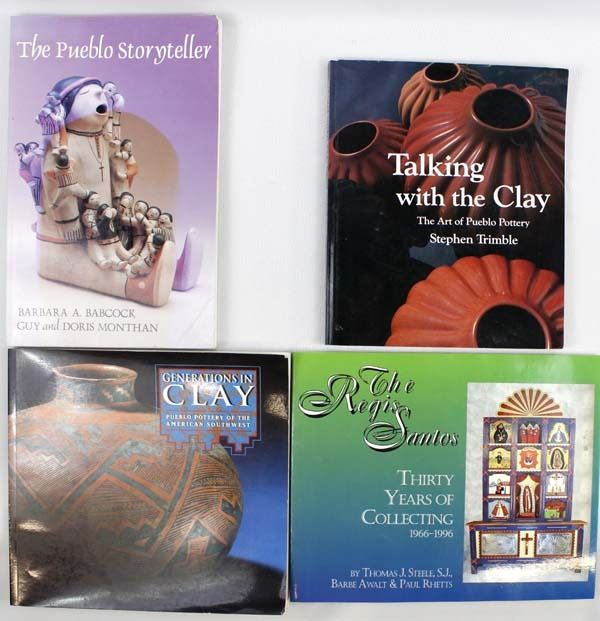 4 Softback Reference Books, includes 1. The Regis Santos Thirty Years of Collecting 1966-1996 by Thomas J. Steele, S.J., Barbe Awalt & Paul Rhetts, LPD Press, 1997 2. The Pueblo Storyteller by Barbara A. Babcock, Guy & Doris Monthan, U of AZ Press, 1992, largest measures 7'' x 11'', like new condition 3. Generations in Clay: Pueblo Pottery of the American Southwest by Alfred E. Dittert, Jr. and Fred Plog. Northland Publishing, 1980. 4. Talking with the Clay: The Art of Pueblo Pottery by Stephen Trimble. SAR Press, 1987.
